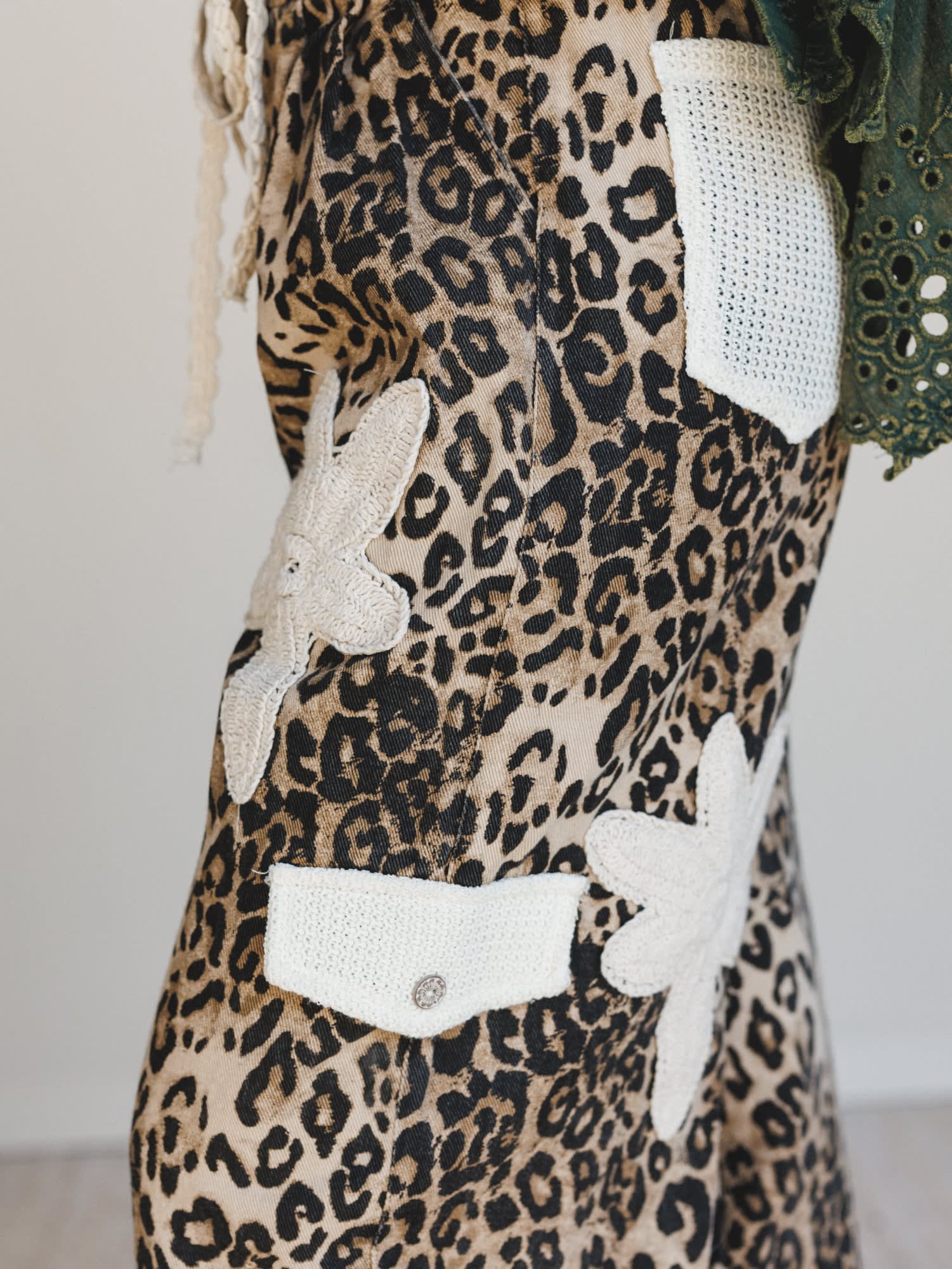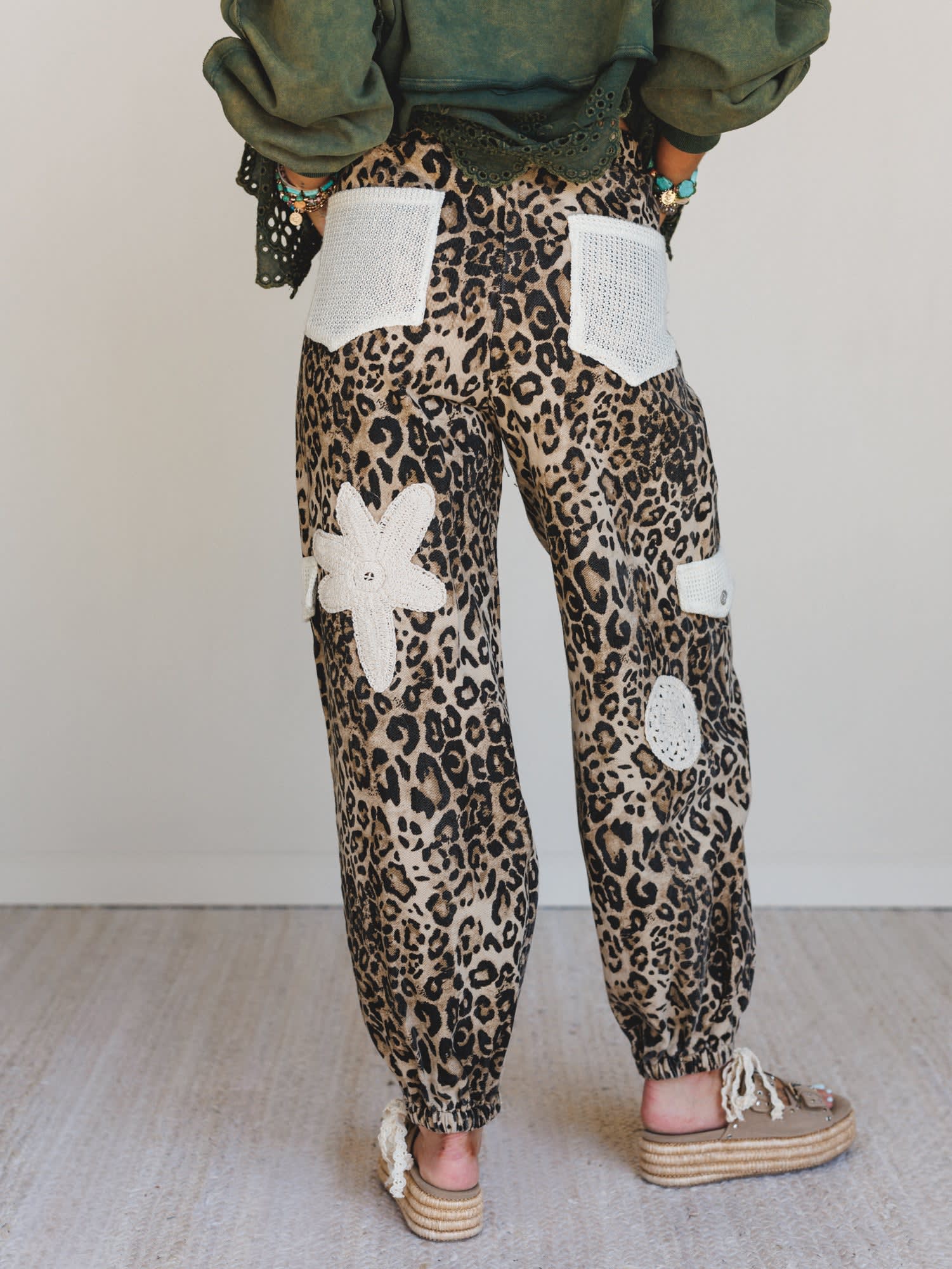• Leopard jogger pants with patchwork accents for a playful statement piece