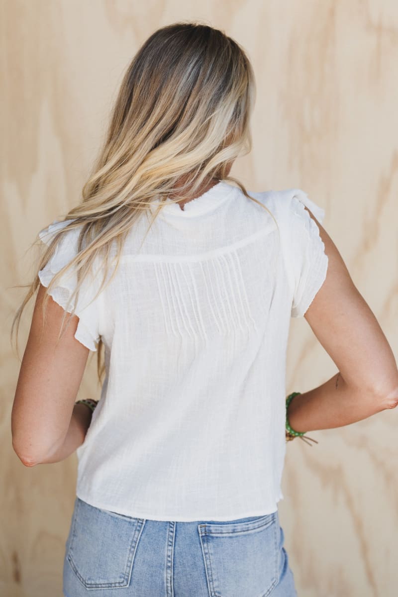 This light and gauzy top pairs perfectly with wide leg overalls and booties.