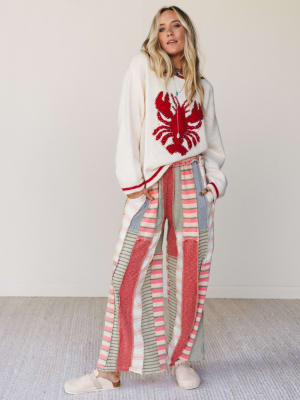 - Cream knit sweater featuring a bold red lobster graphic and pearl-like stud accents for a fun, preppy pop