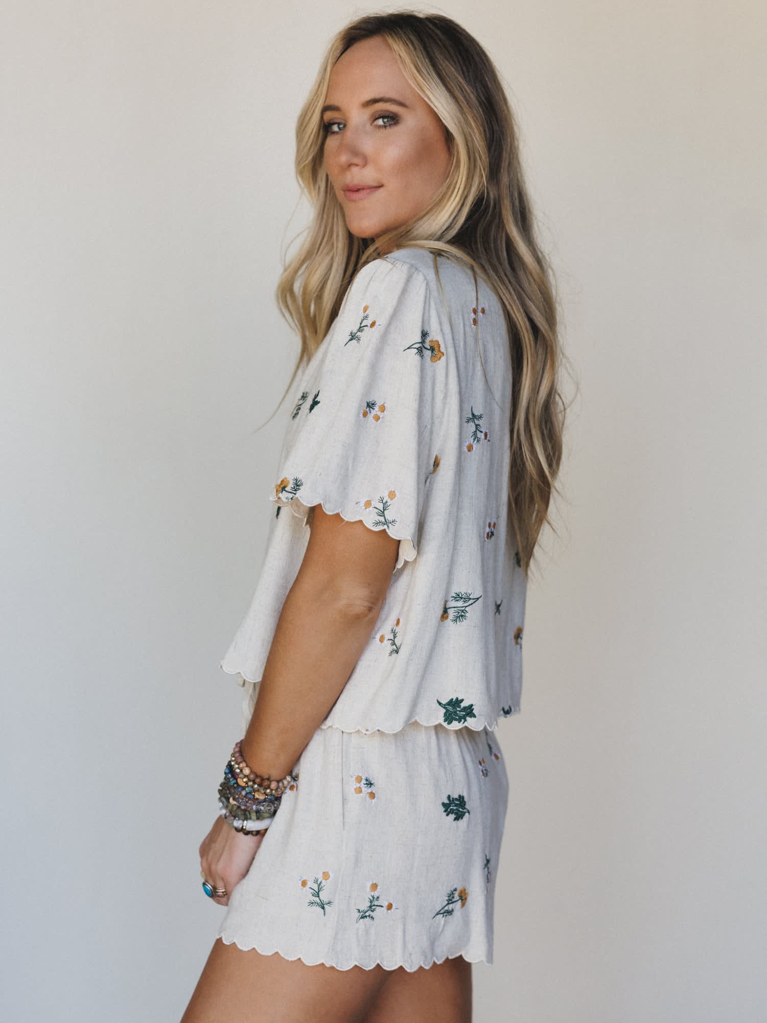 The boho crop top that looks just as gorgeous paired with the matching shorts as it does with your favorite wide leg pants or a flowy maxi skirt — this embroidered linen tie front is a warm weather essential.