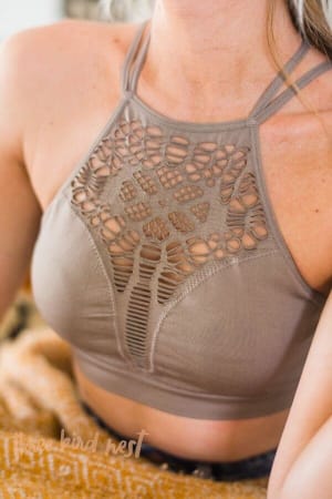 Made to be seen, this bralette has open weave like floral cut-outs that start high at the neck and dip along the decolletage. Intricate, airy-stitch traces the stretchy fabric of this bralette’s sweetheart neckline and offers a low, strappy back to layer with so many styles.
