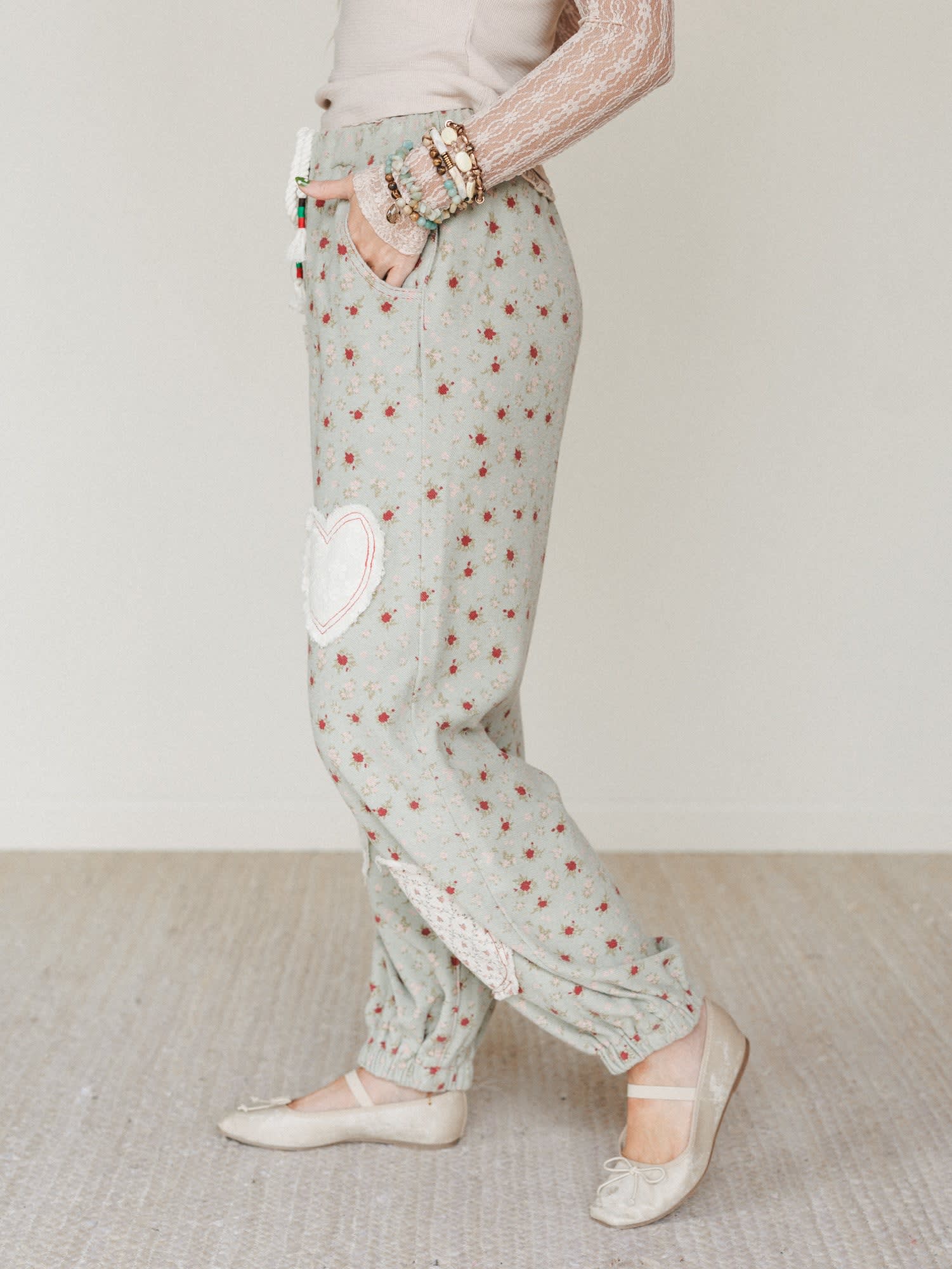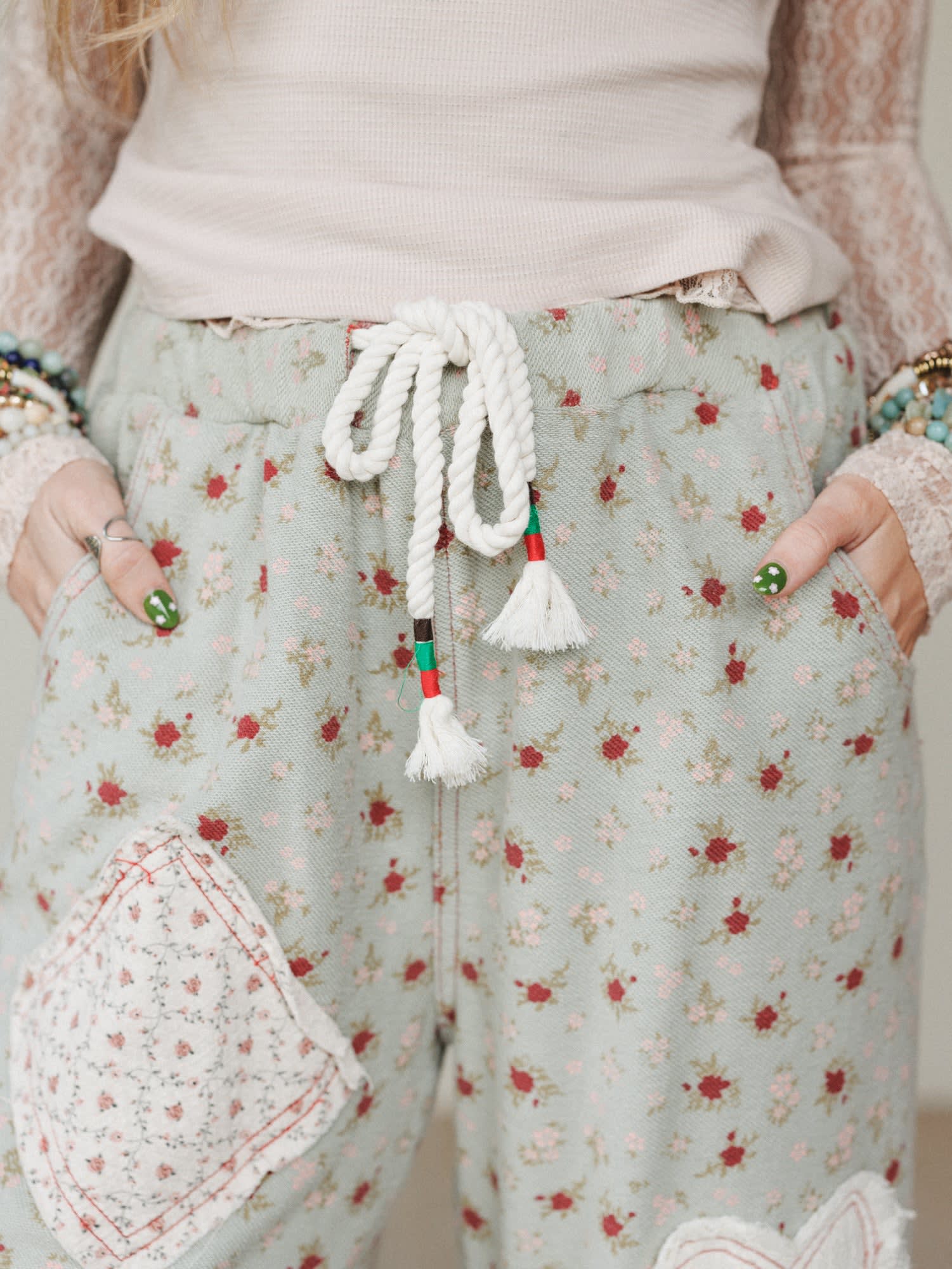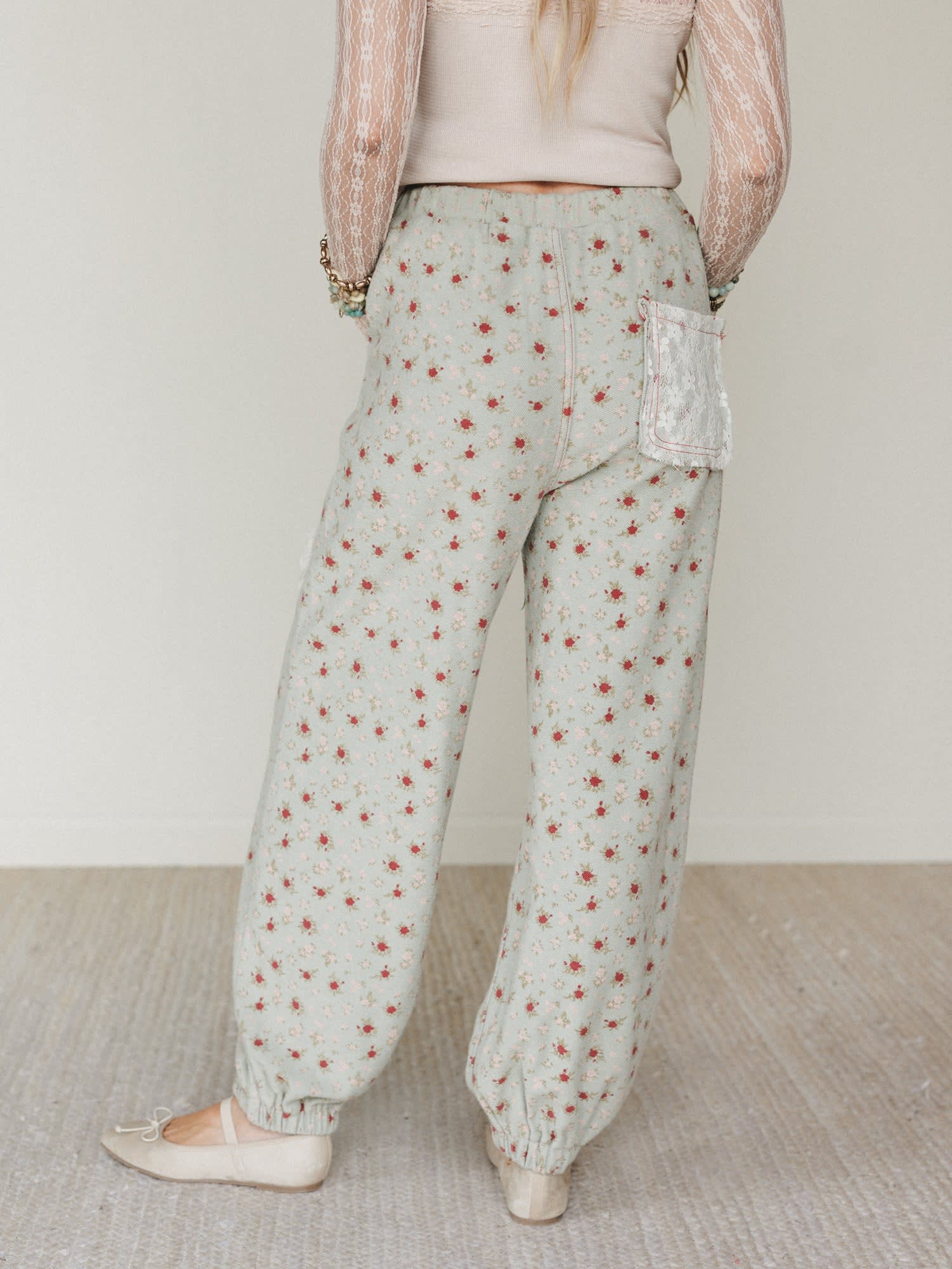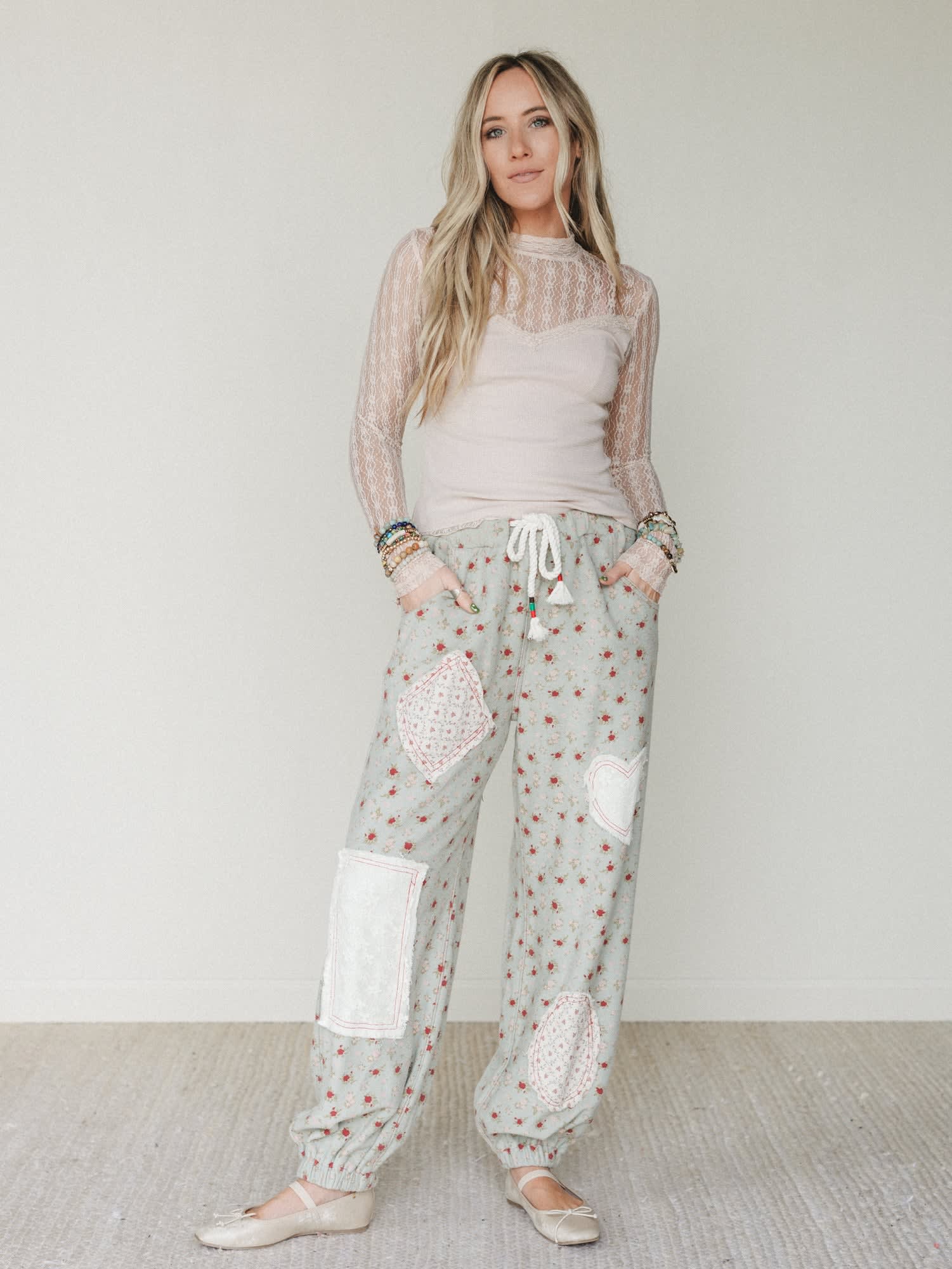 - The Nora Patchwork Floral Pants bring playful charm with a relaxed jogger fit in soft sage green with floral patchwork details.