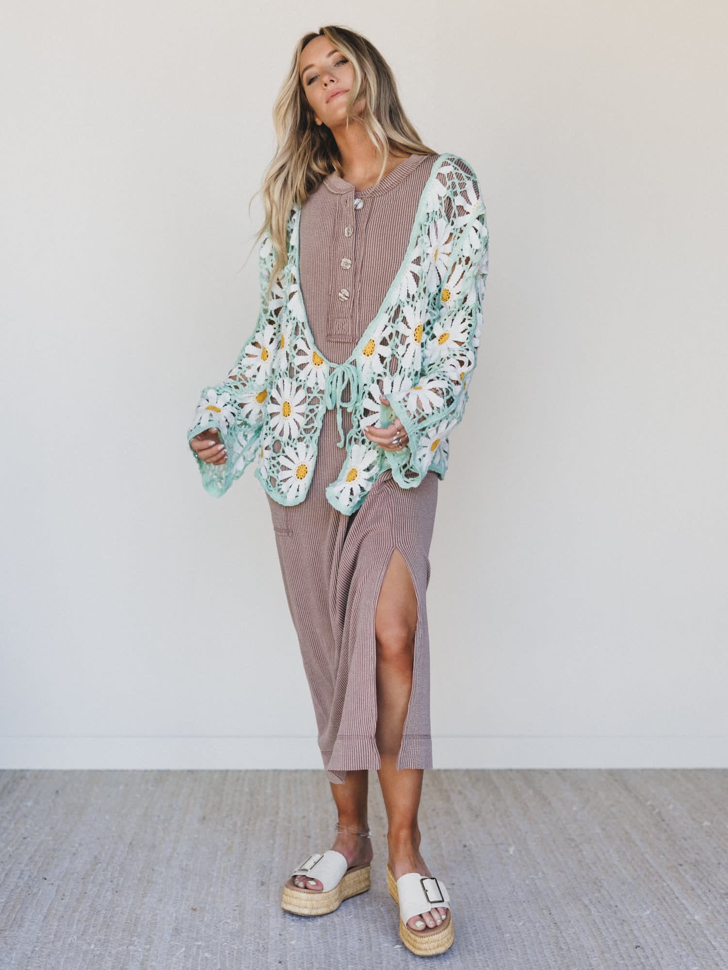 The boho cardigan that stops people in their tracks — this hand-crafted daisy crochet cardigan is the kind of statement piece you throw on over anything and suddenly have the best outfit in the room, whether you're at a spring festival or just out for coffee.