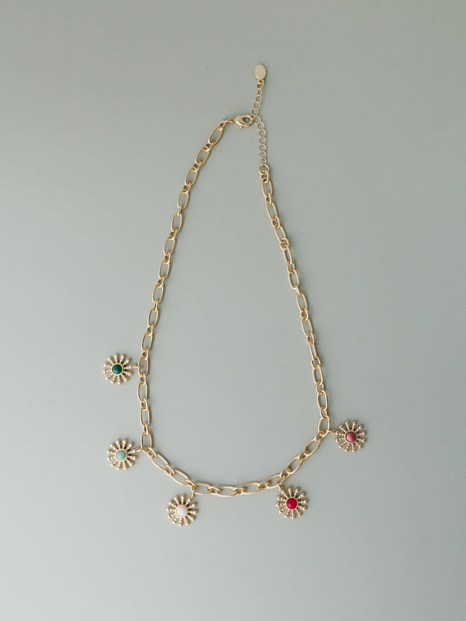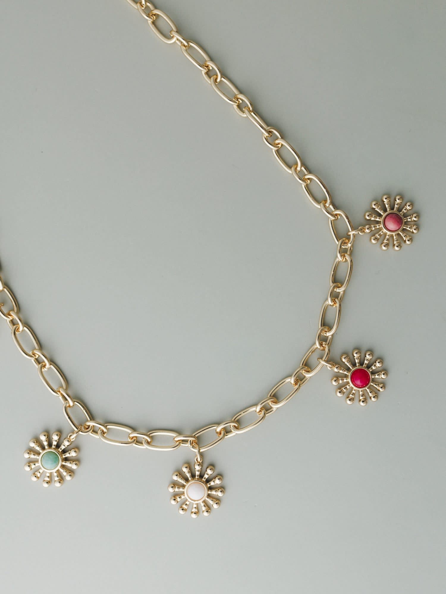 - Five removable sunburst charms with gem centers dangle beautifully along the chain