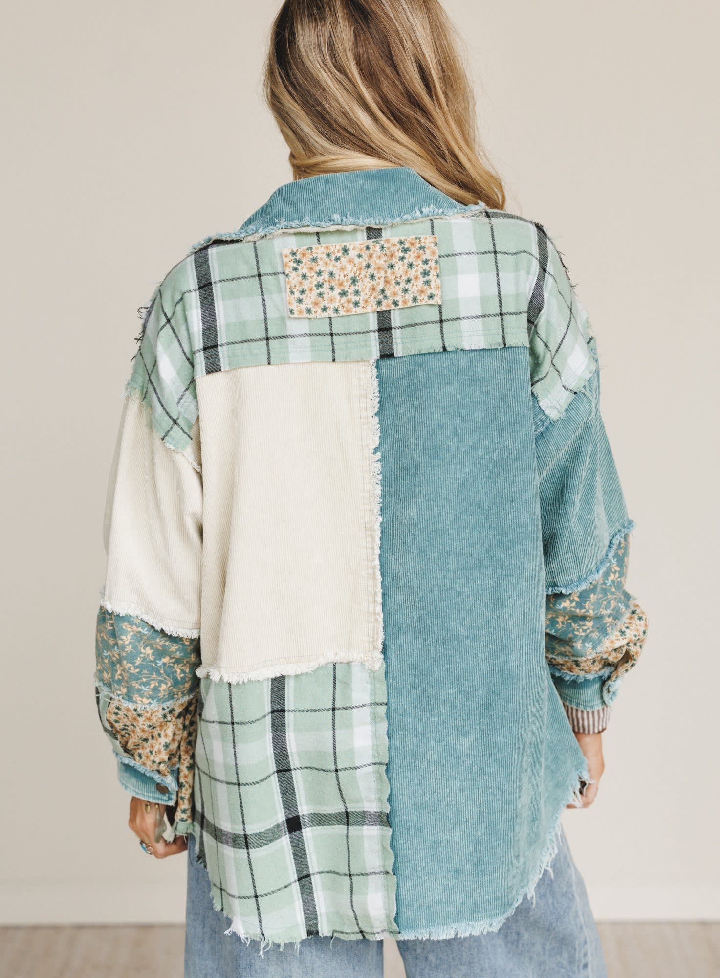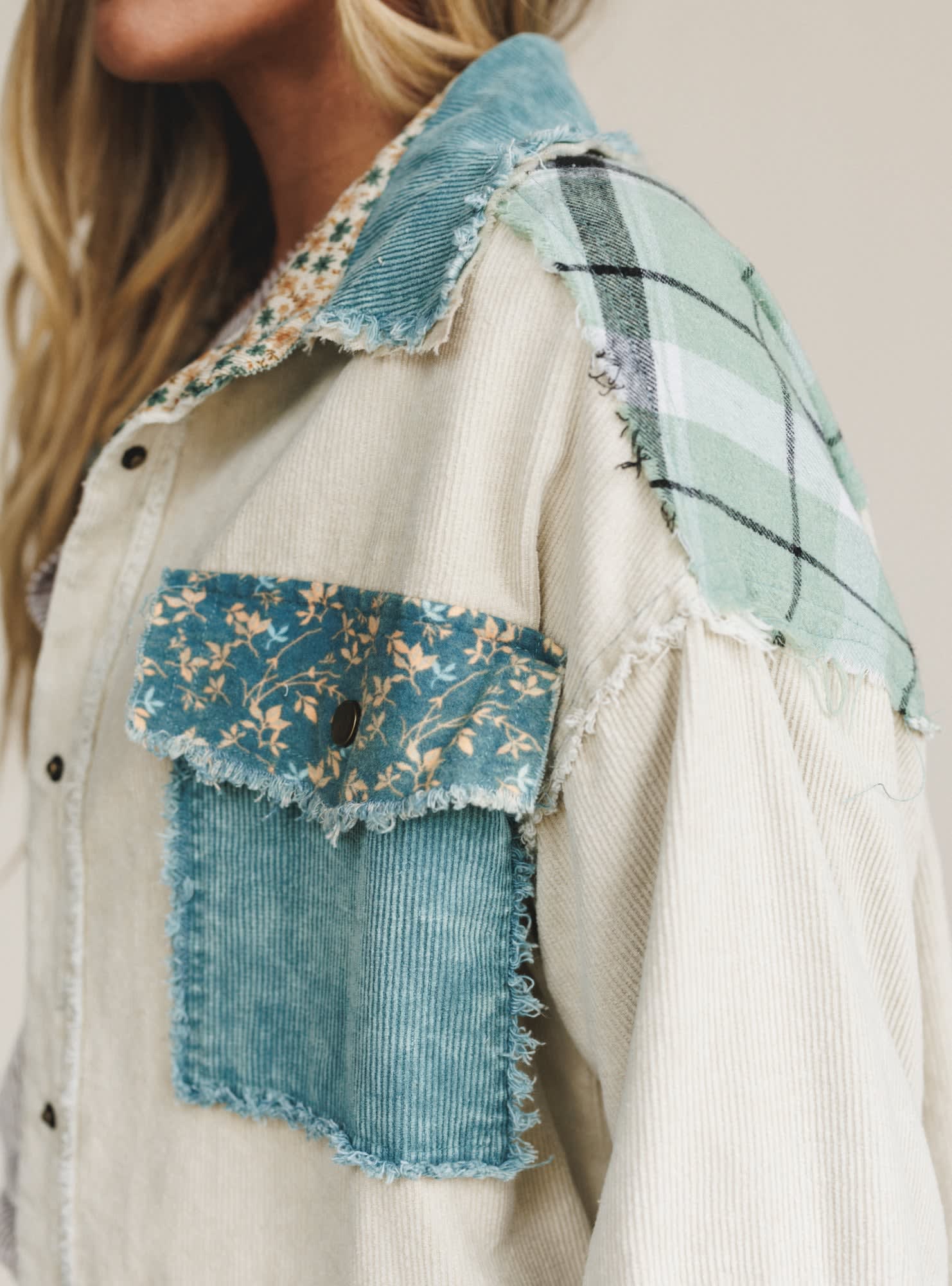 - Textured cotton corduroy base with contrast floral, plaid, and vintage patchwork accents
