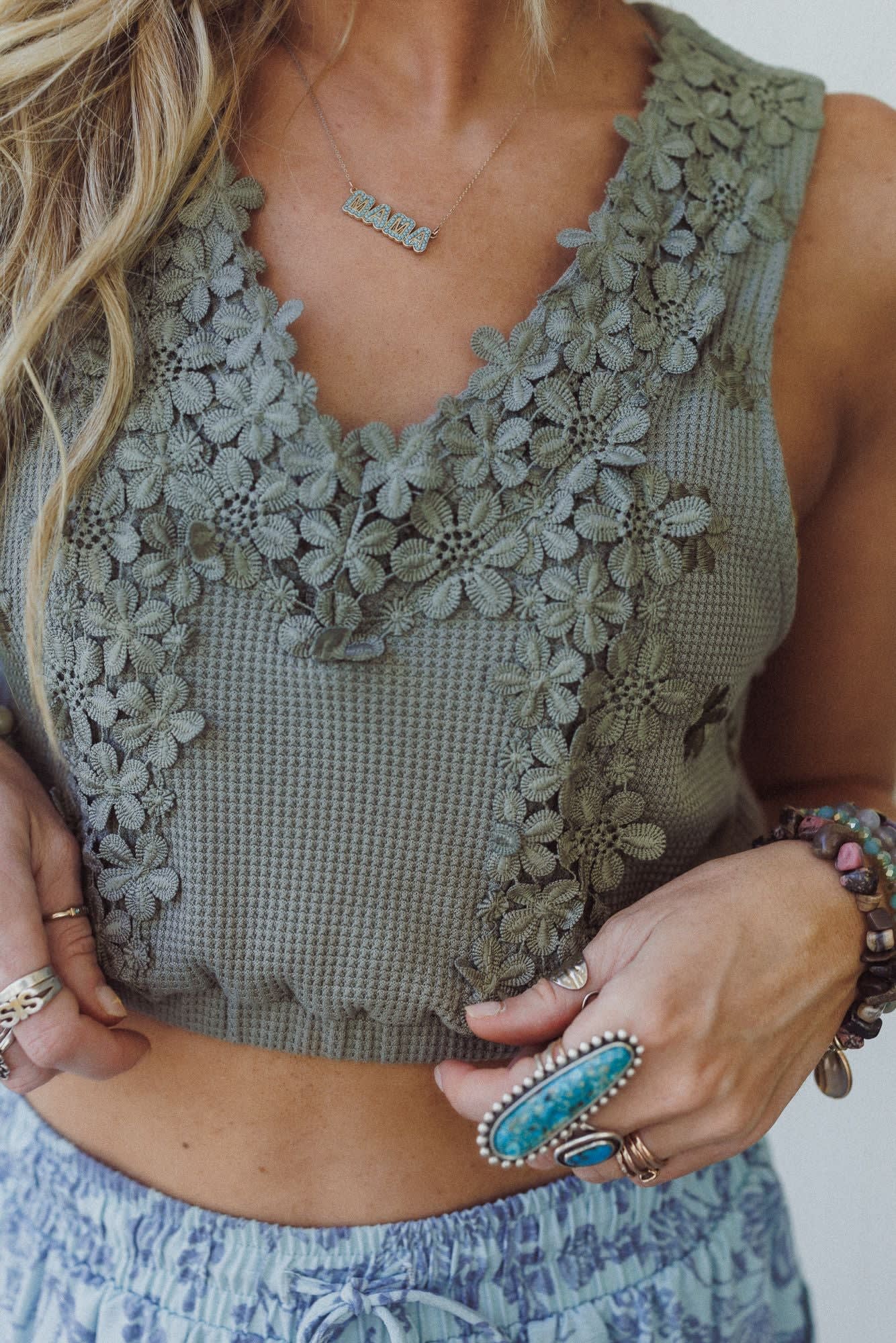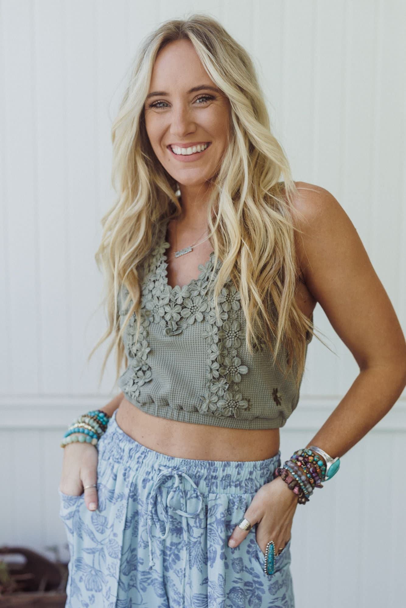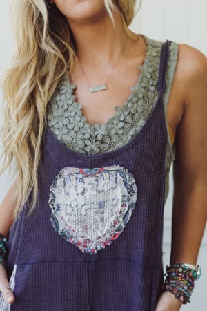 This floral tank looks amazing under overalls or with bell bottom jeans.