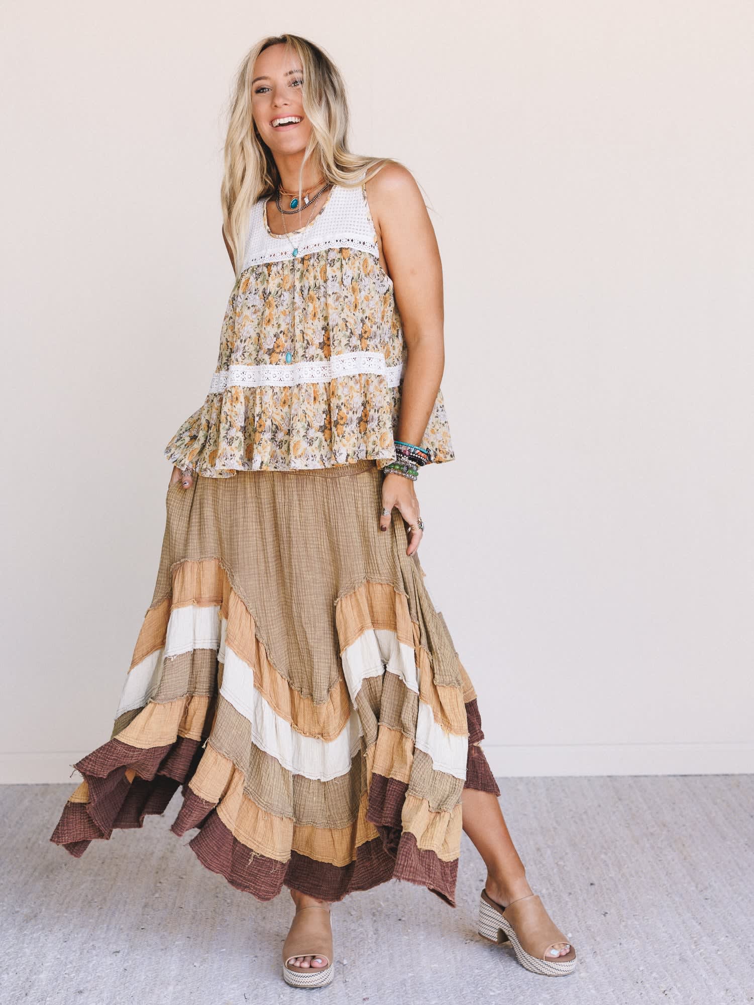 - Flowy, tiered silhouette with a relaxed fit