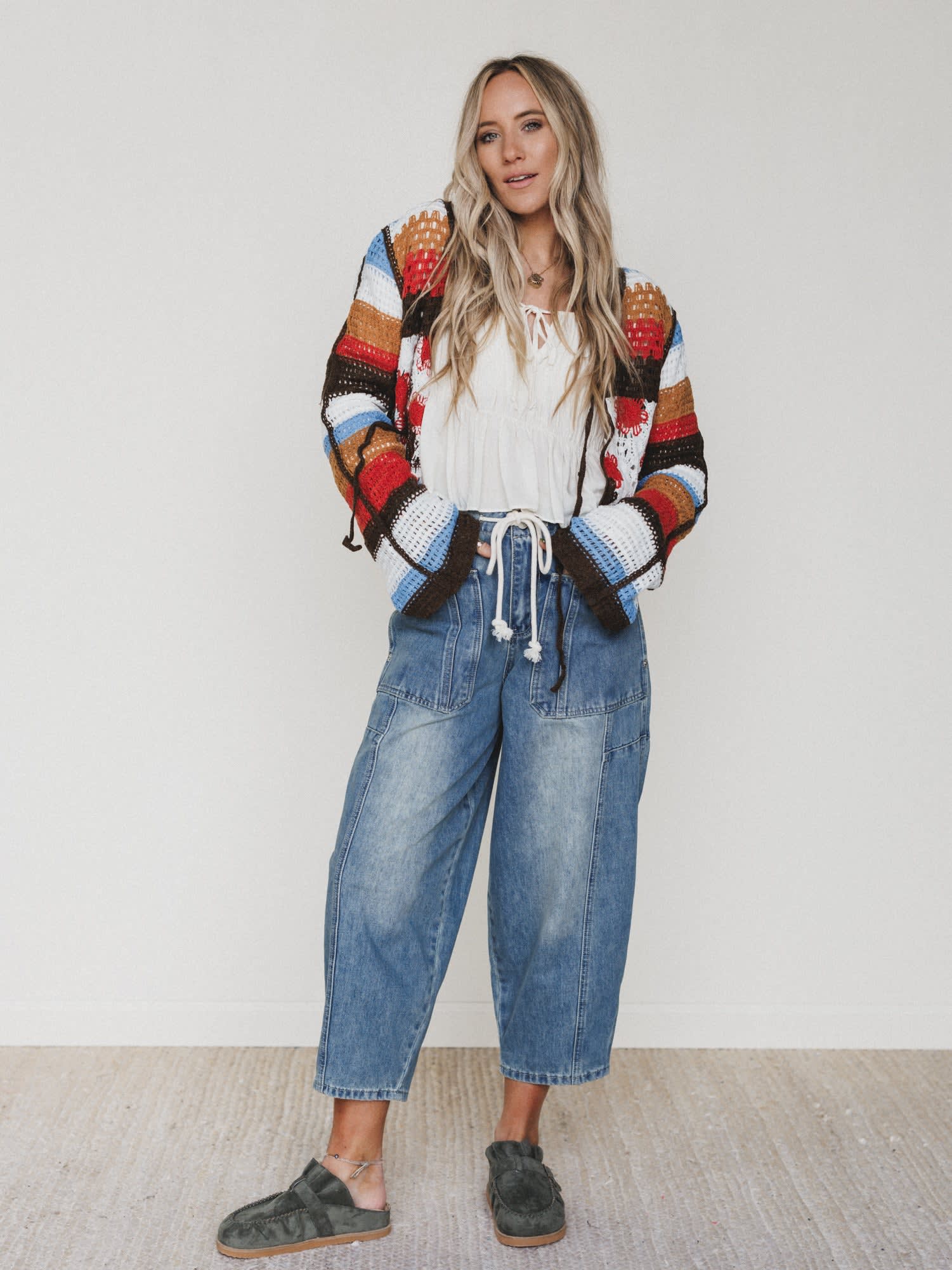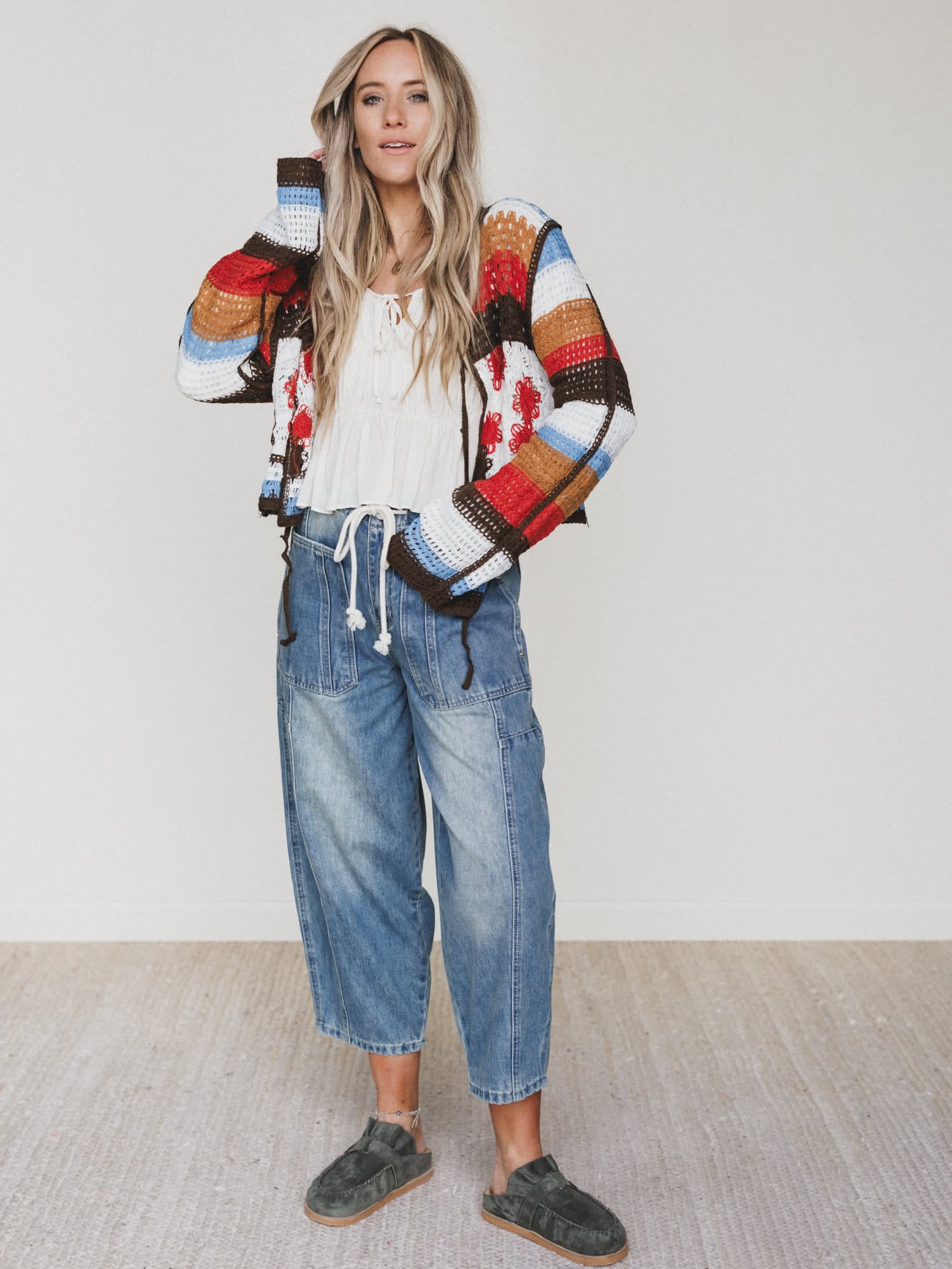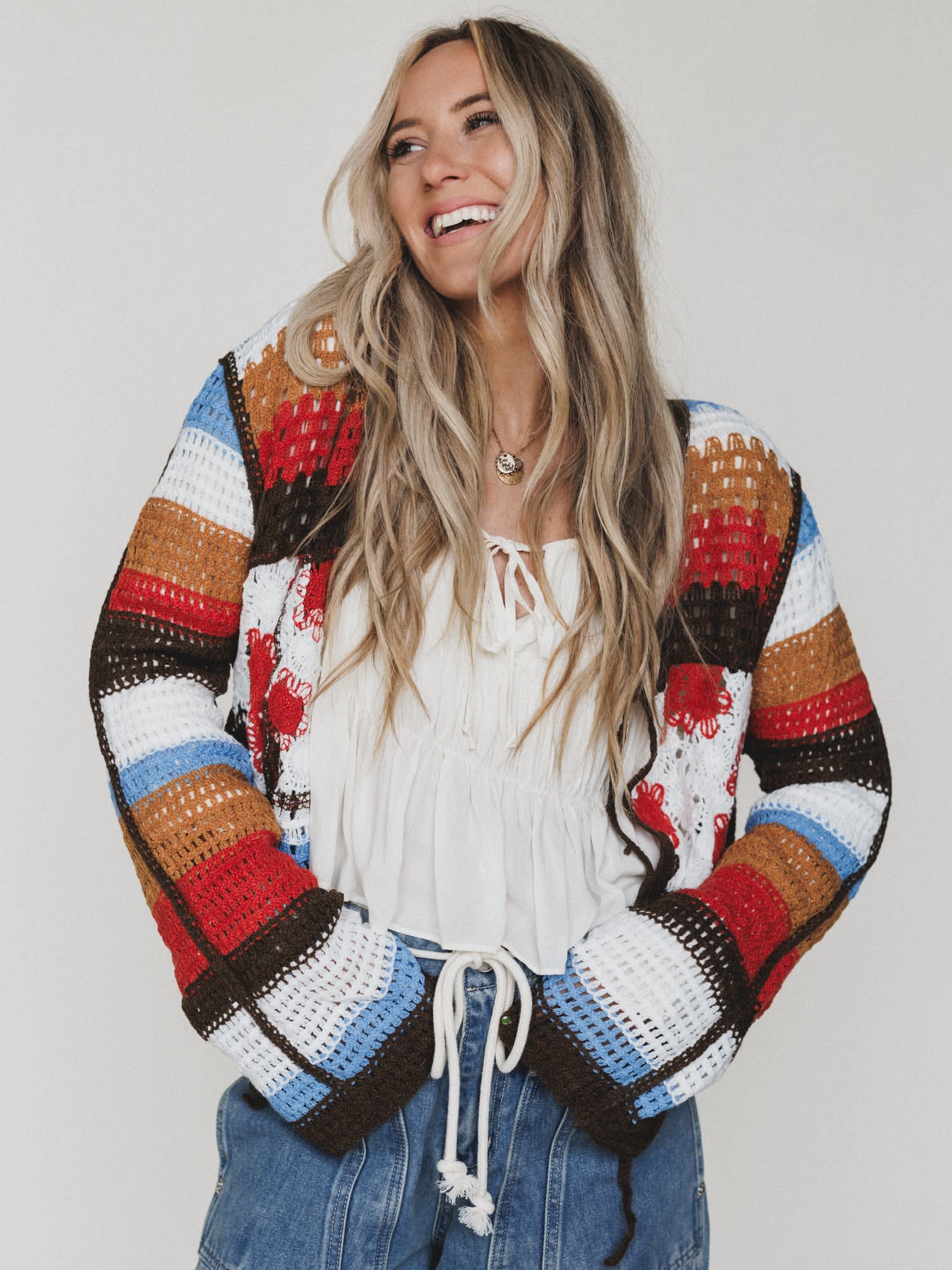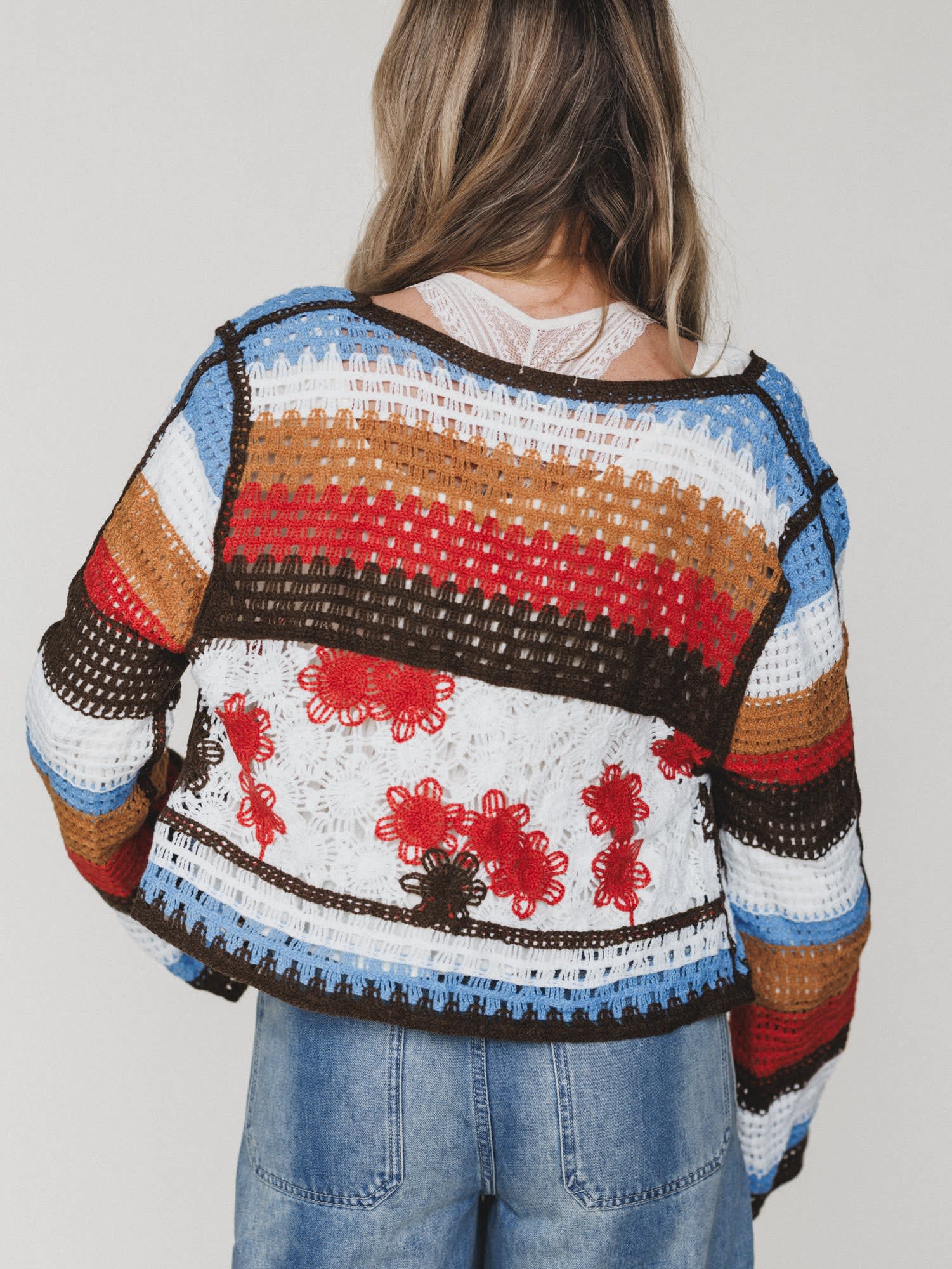 Retro charm meets handcrafted texture in the Flower Power Cardigan. With its bold stripe sleeves, floral crochet details, and cropped silhouette, this piece brings instant vintage-inspired personality to any outfit.