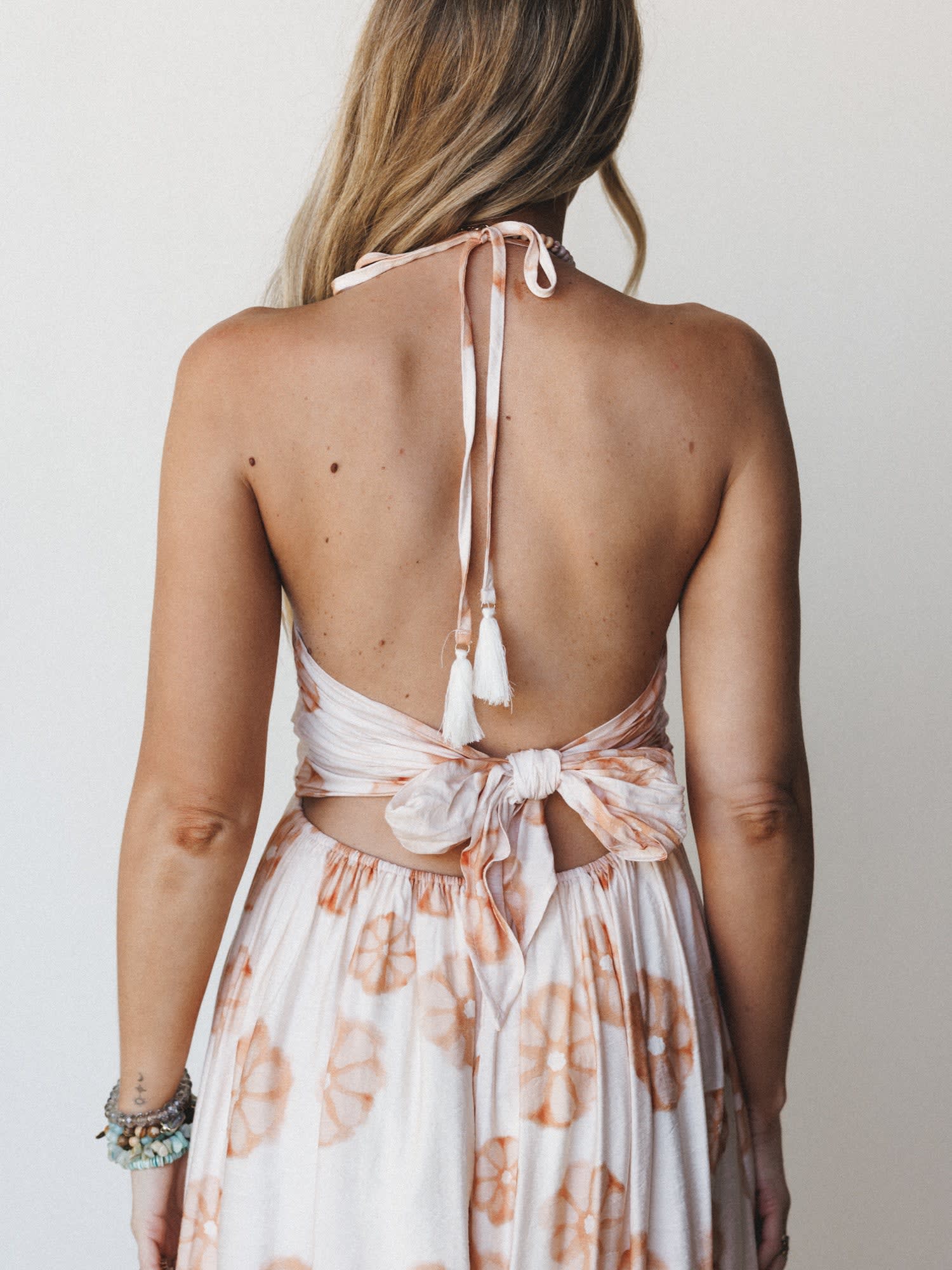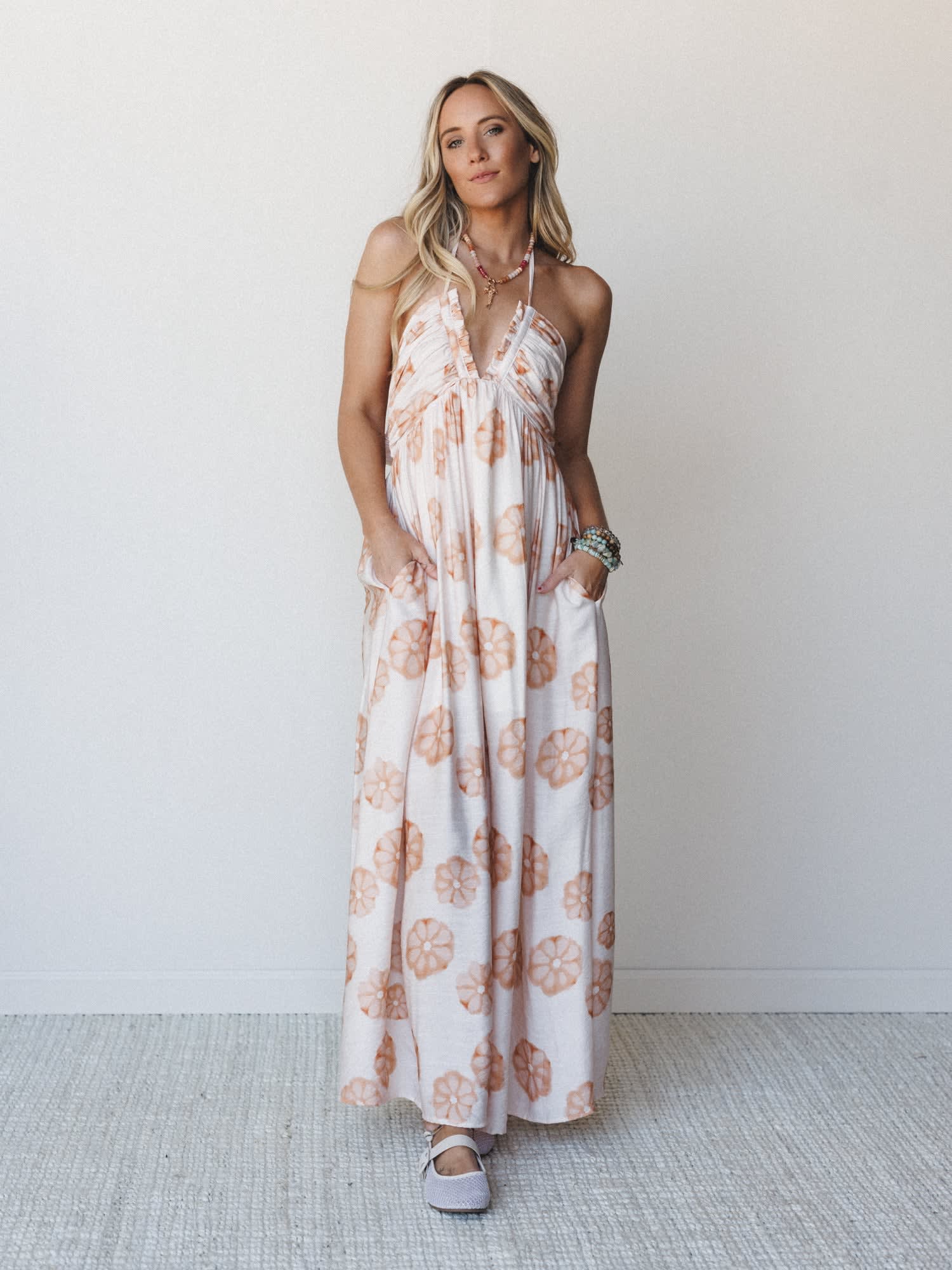 - Halter-style maxi dress with deep V-neckline and flowing silhouette that flatters every figure.