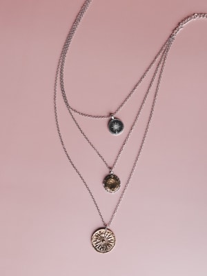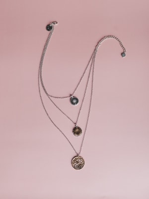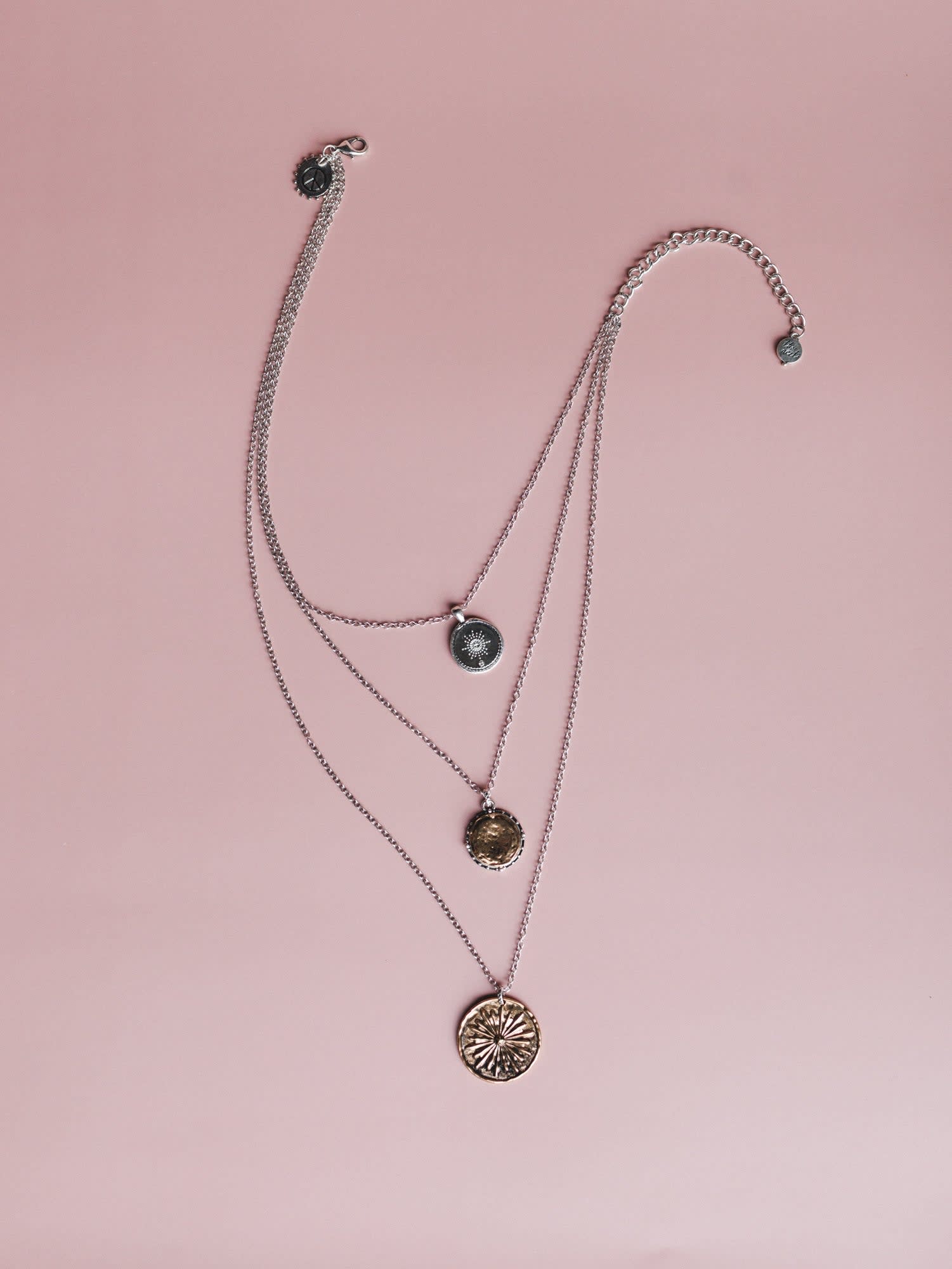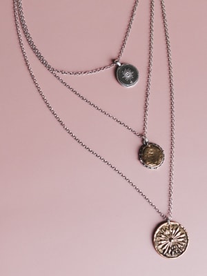 - Three-tiered silver chain with mixed metal coin pendants