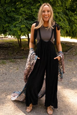 - Overall jumpsuitΒ style with a flattering scoop waistline andΒ adjustable self-tie straps
