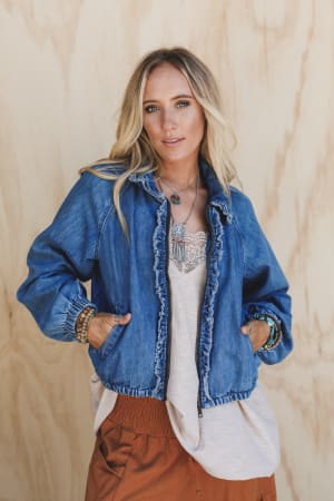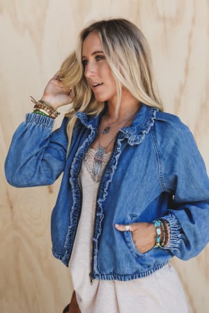 - Ruffled denim bomber jacket