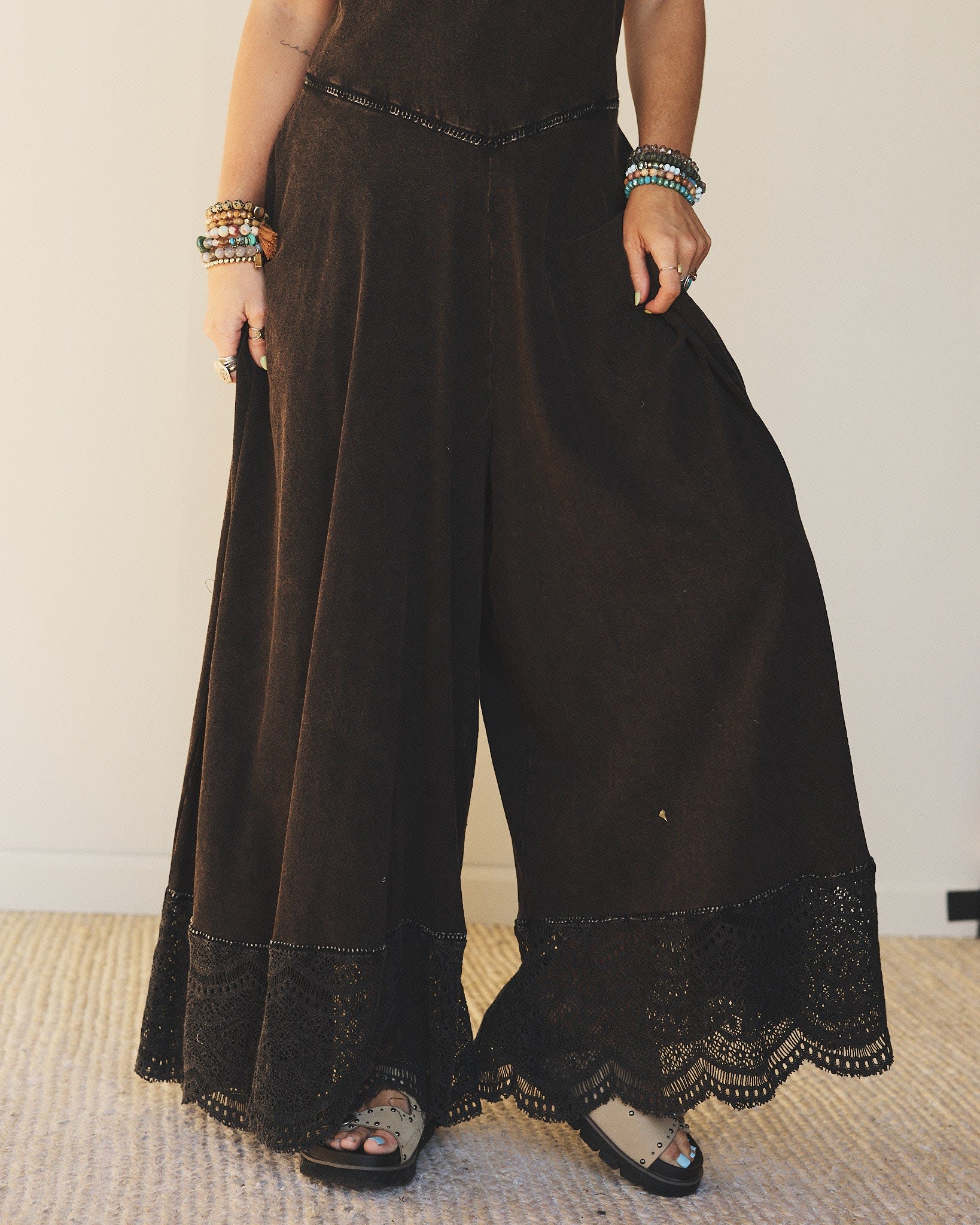 • Wide leg silhouette with crochet lace trim that sways with every step