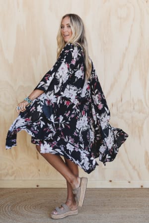 A beautiful, flowy kimono featured in a lightweight, breathable fabric with butterfly sleeves, a maxi length, and a floral pattern.