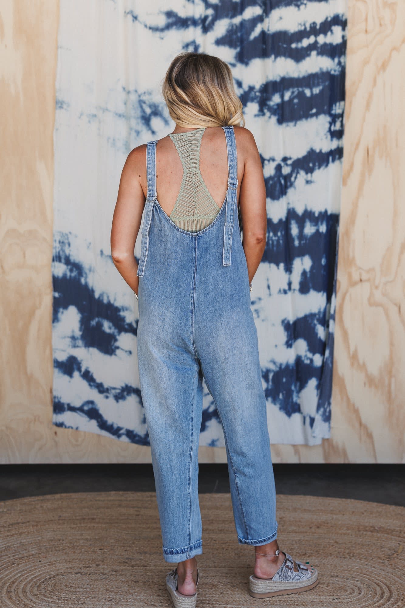 This relaxed denim jumpsuit pairs perfectly with strappy sandals and a fitted tee for an elevated casual look.