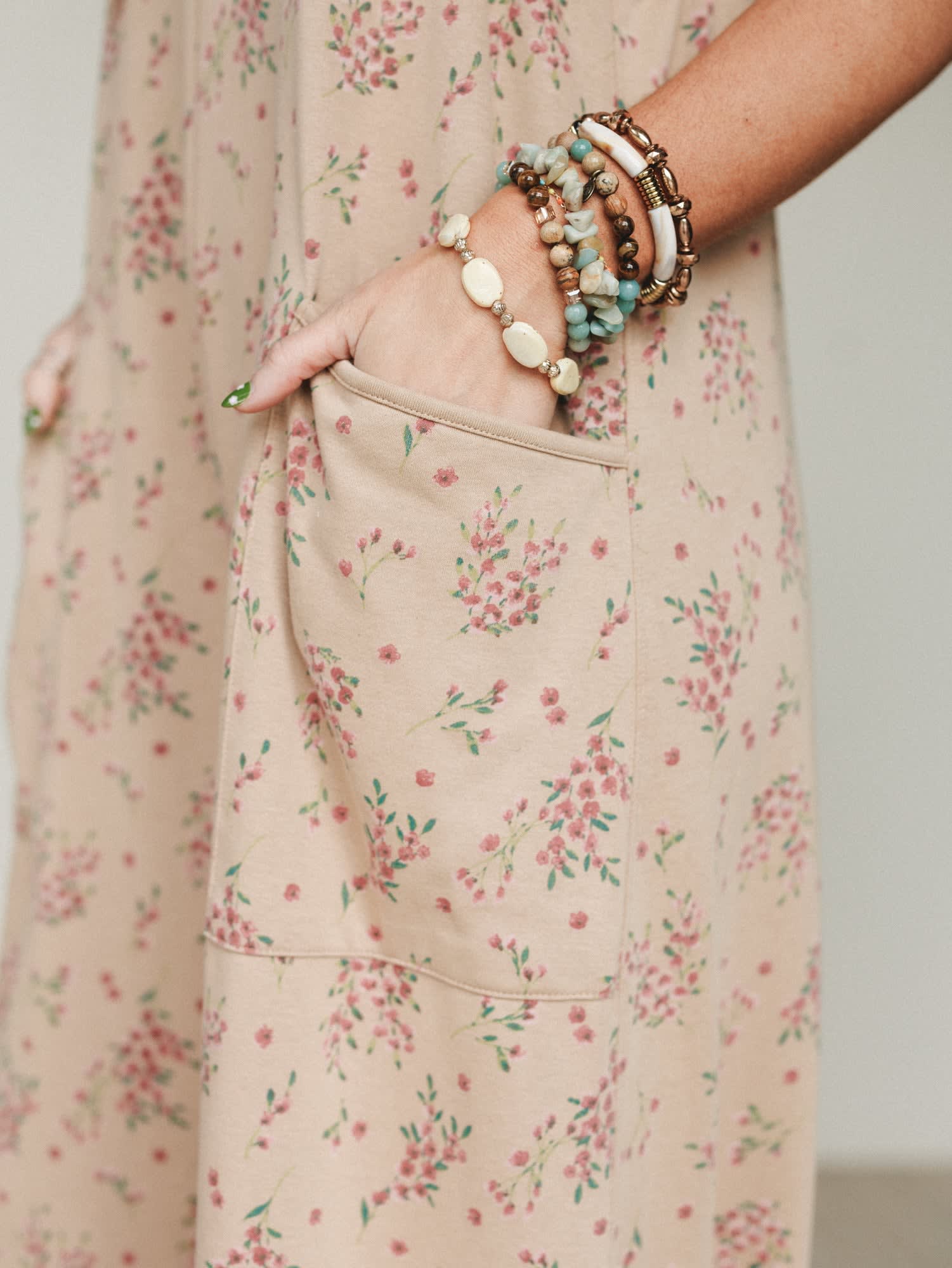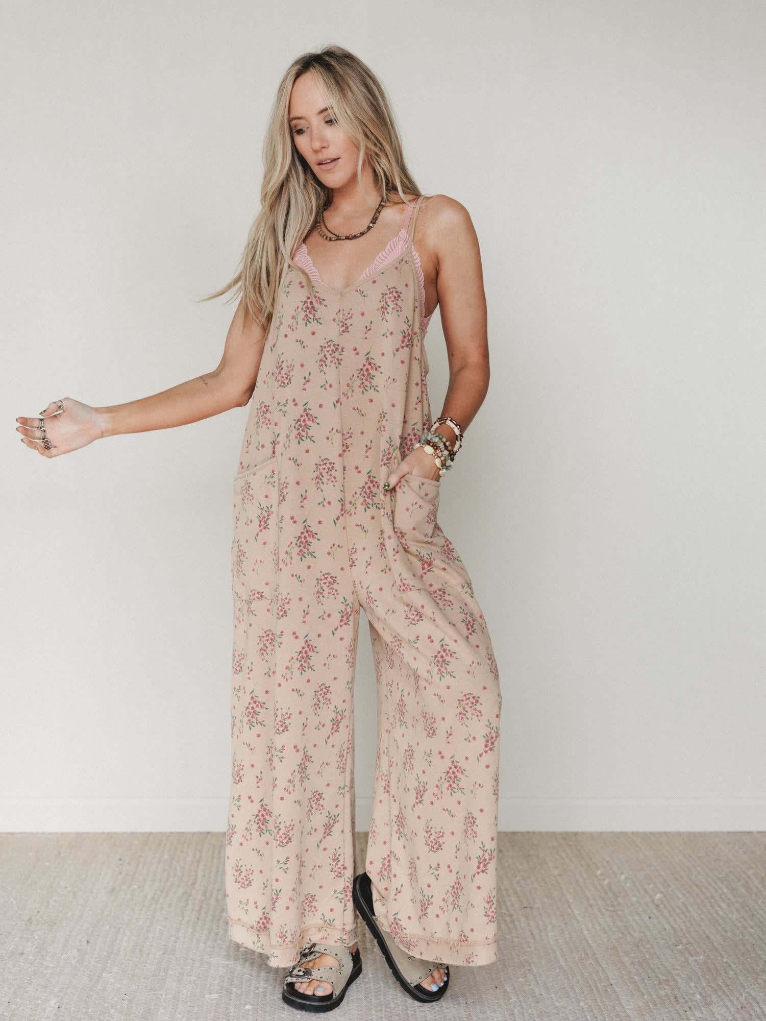 • Soft khaki floral print with delicate pink blooms for a relaxed boho jumpsuit look