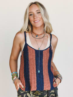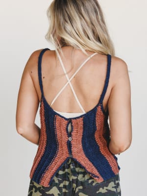 - Striped knit cami with a casual fit and subtle back button detail