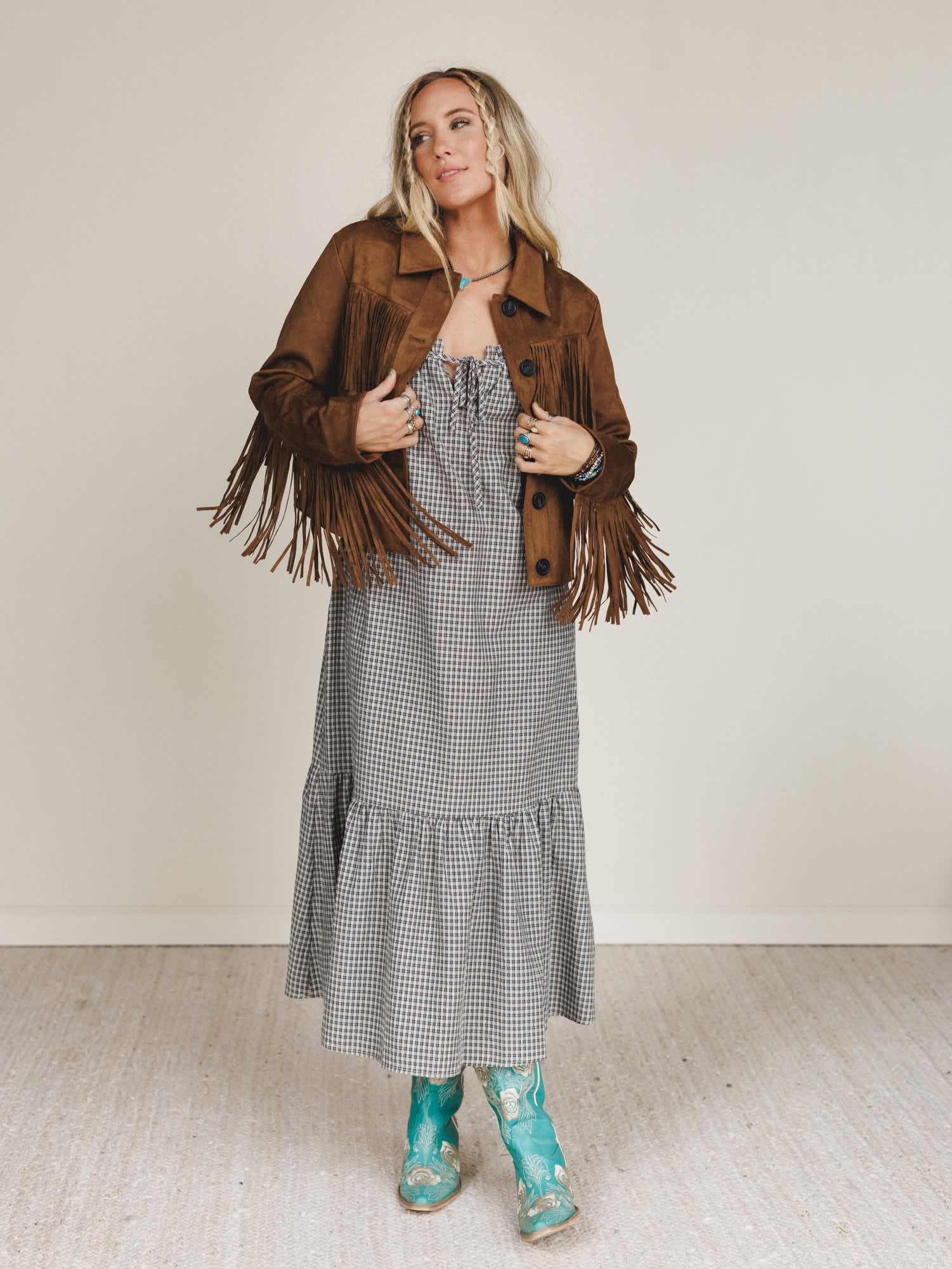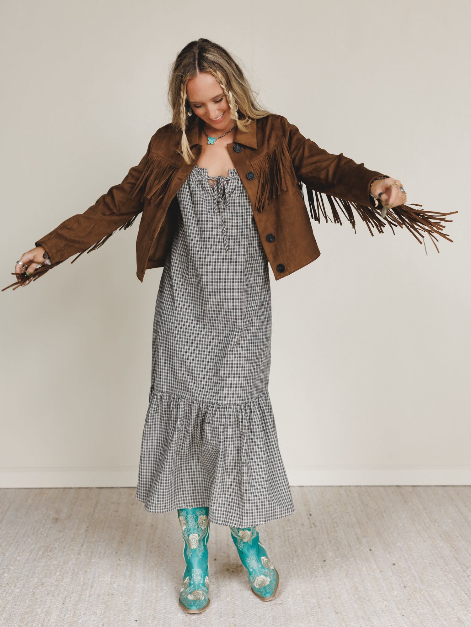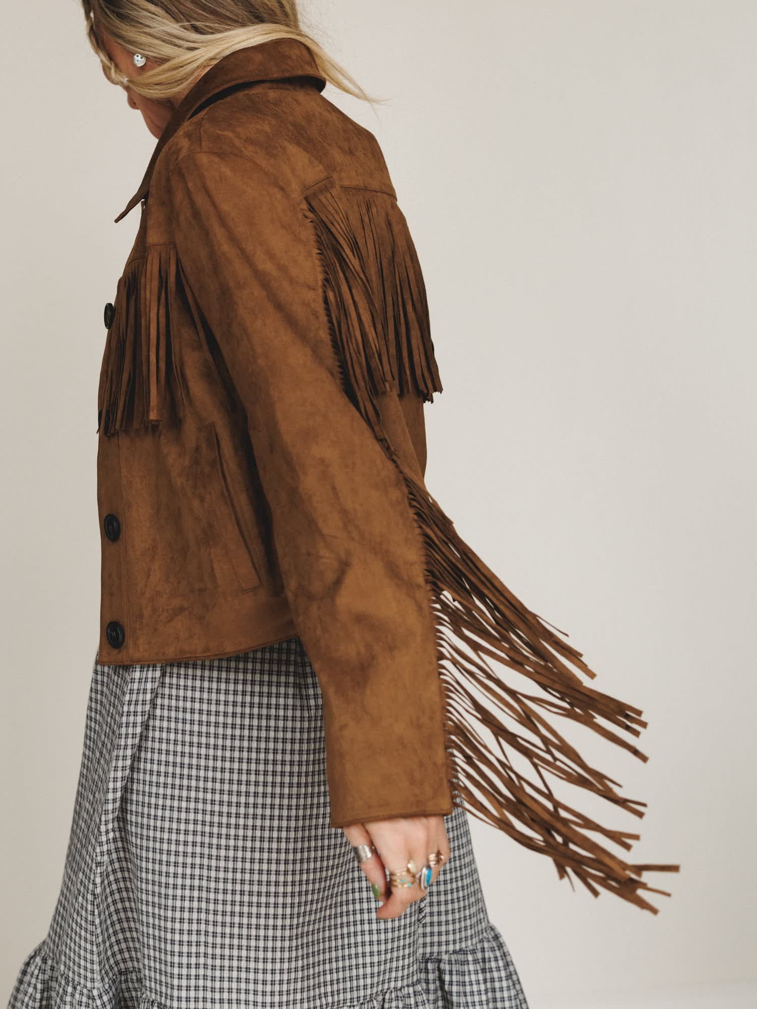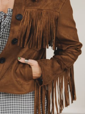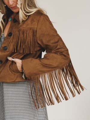 Give ‘em something to twirl about. The Fringe Theory Suede Jacket brings a bold, Western-inspired edge to your wardrobe with a soft suede feel and all the fringe your free spirit could ask for. Whether you’re line dancing under the stars or brunching with the girls, this jacket is made for movement and major main-character energy.