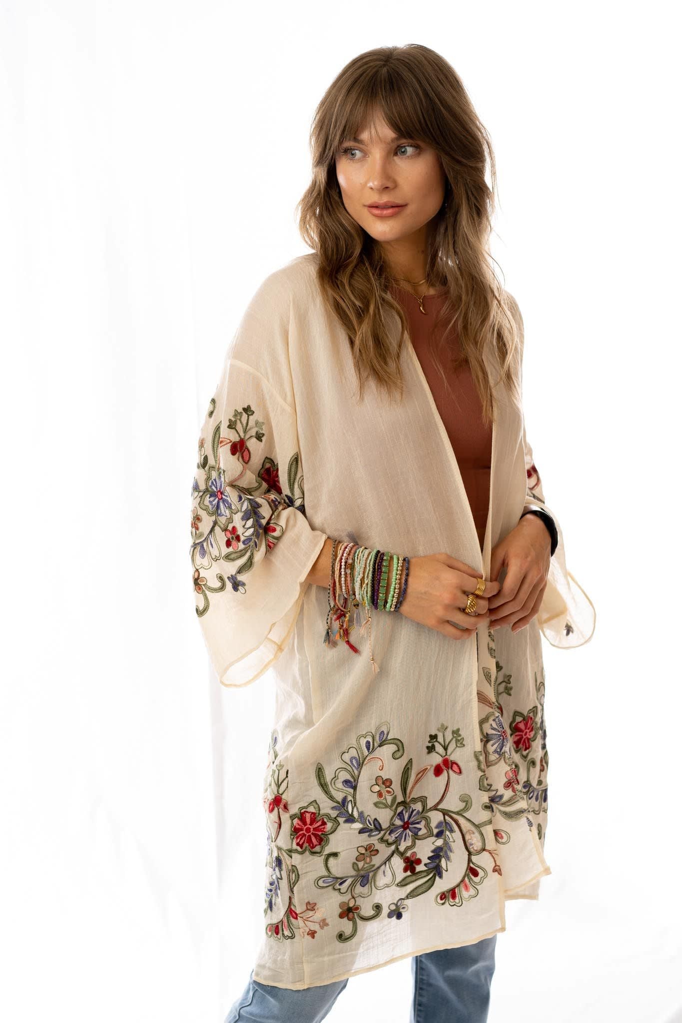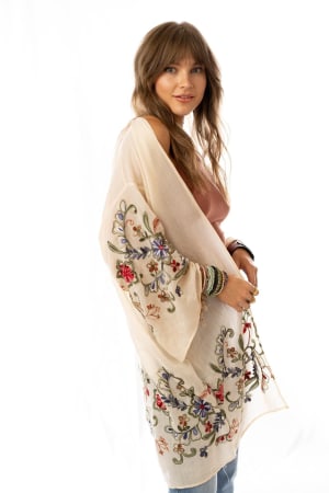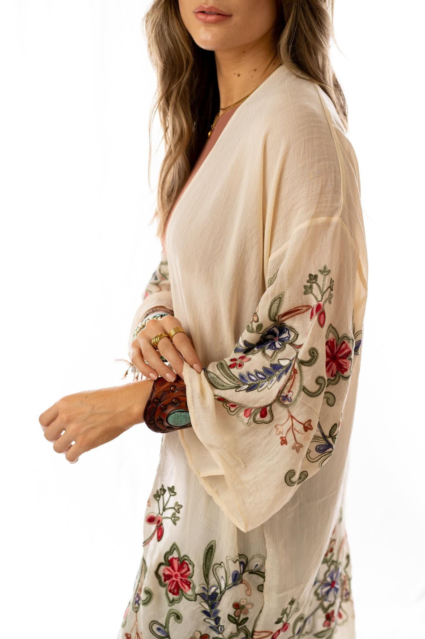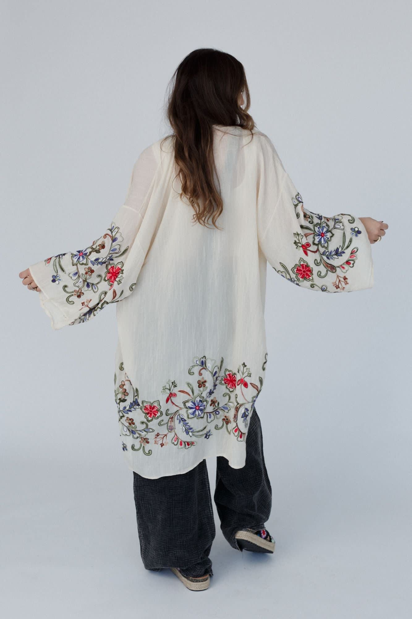 Nothing is more fun than a kimono covered in floral! This perfect layering piece features a sheer fabric in a longline silhouette with accents of crochet florals in multi colors along the hem and wide sleeves!