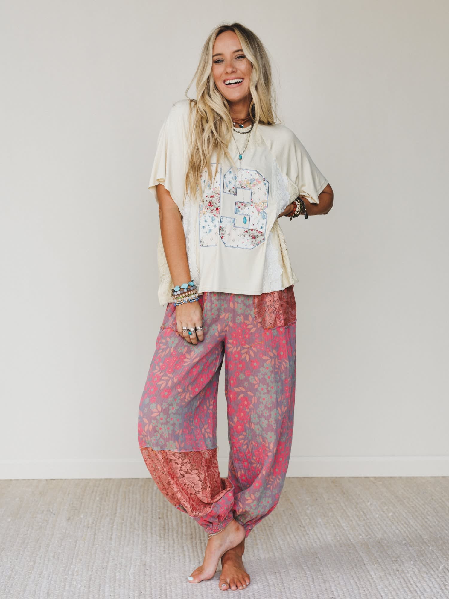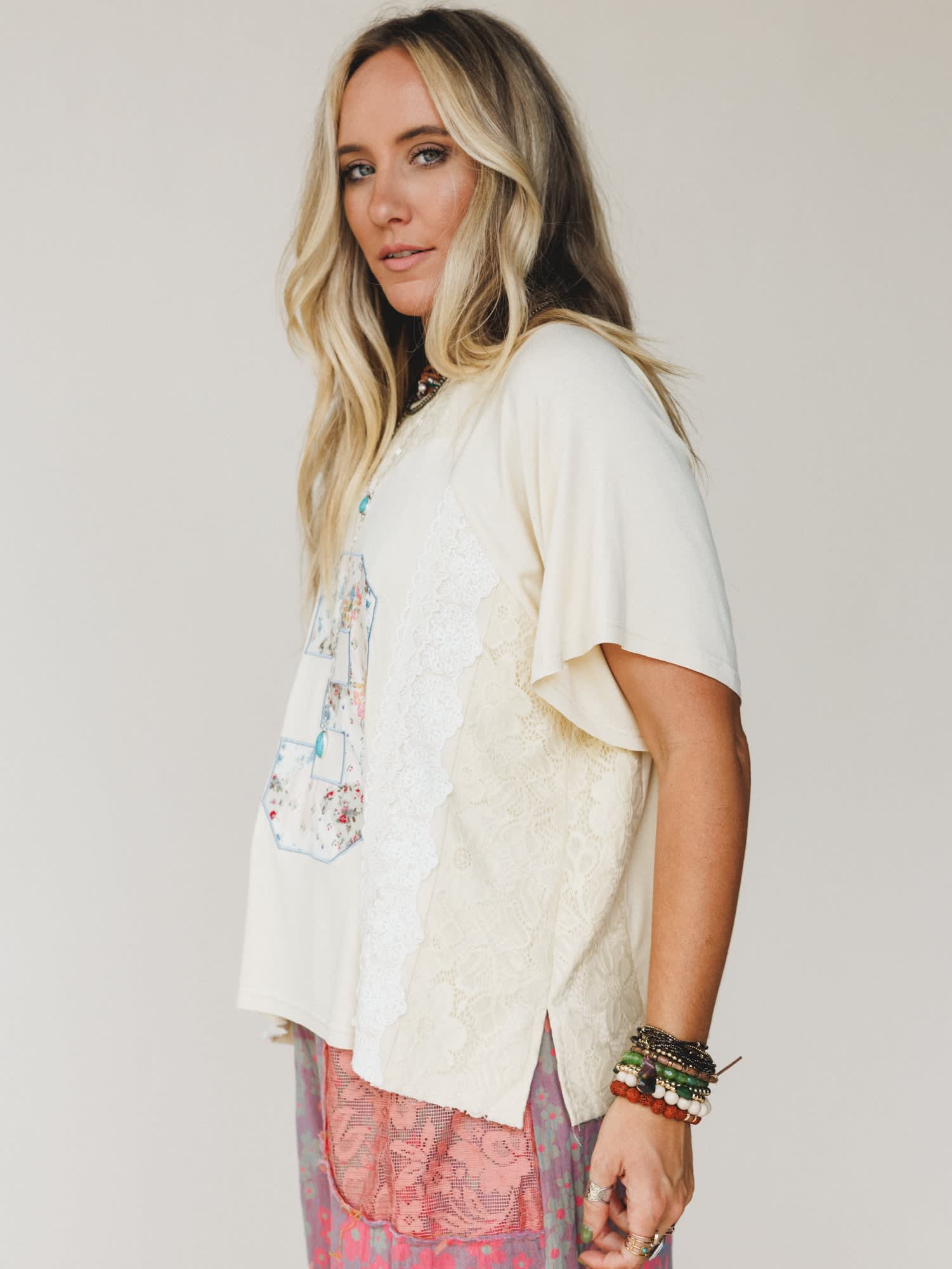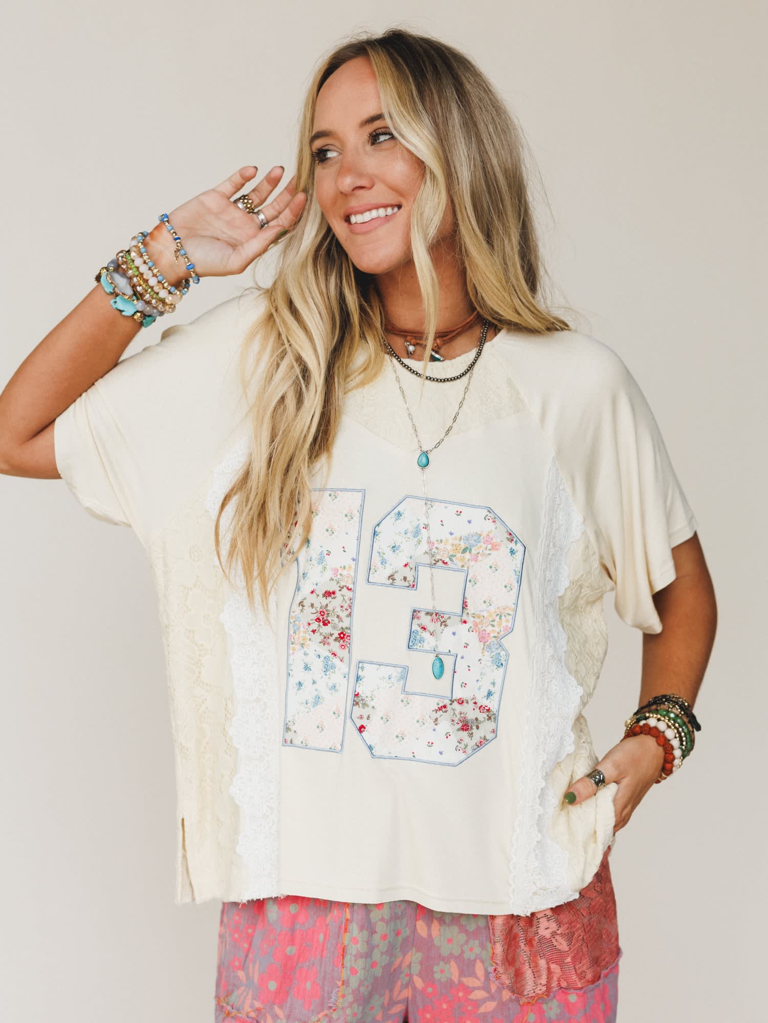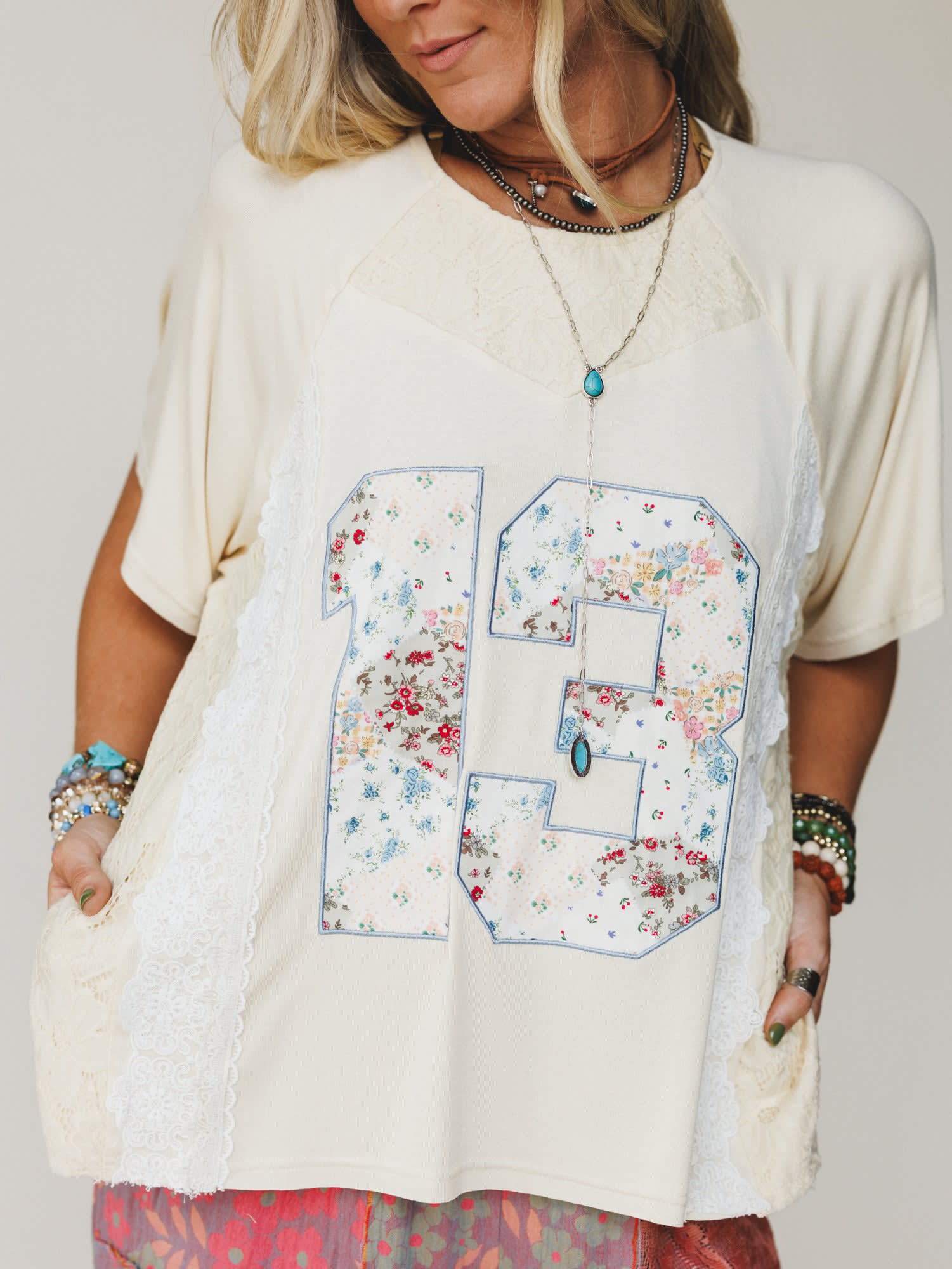 A playful twist on a vintage sports tee, the Game Plan Lace Detail Top brings sweet femininity to casual comfort. Floral patchwork numbers and lace insets add a romantic touch to this easygoing silhouette.