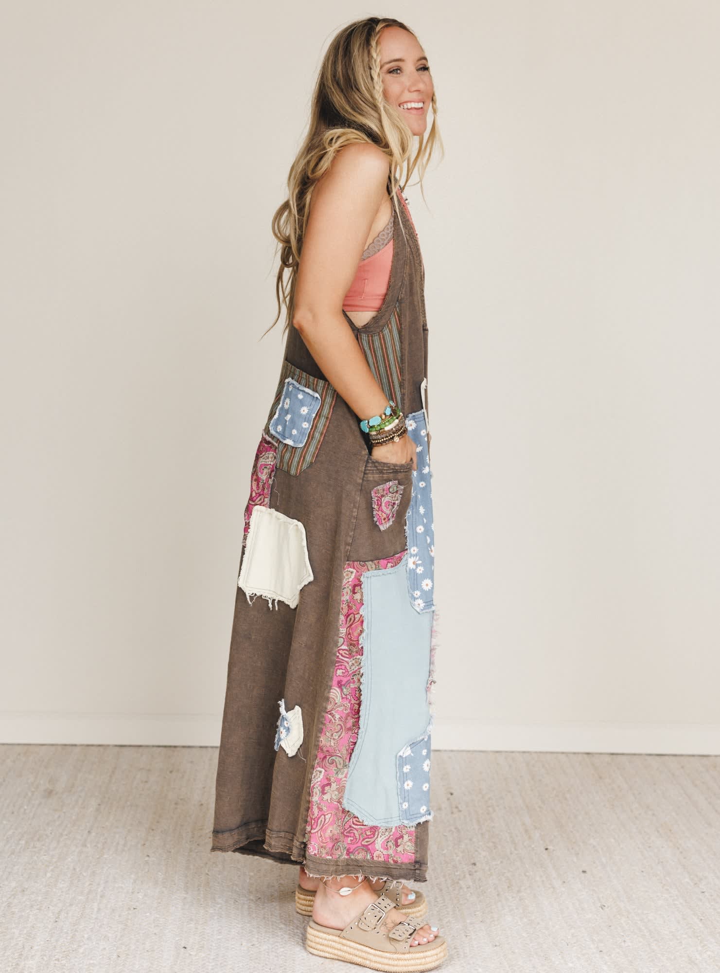 Boho dreams meet playful patchwork in the Garden Drift Wide Leg Jumpsuit. With its breezy silhouette and vintage-inspired details, this one-piece wonder is made for carefree days, creative styling, and dancing barefoot in the grass. Every patch tells a story—now it’s your turn to write the next chapter.