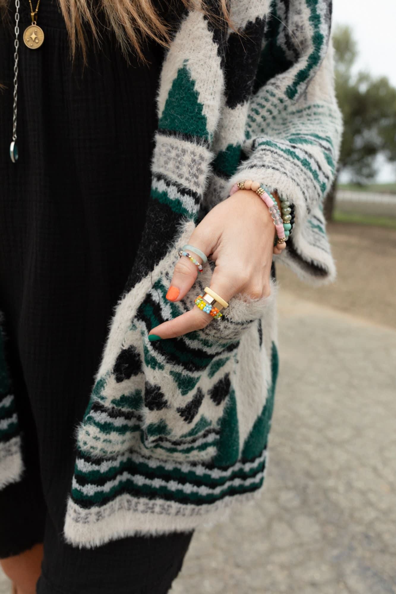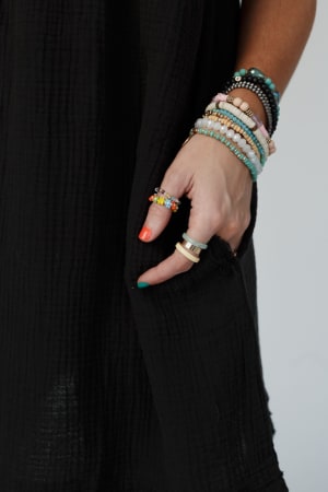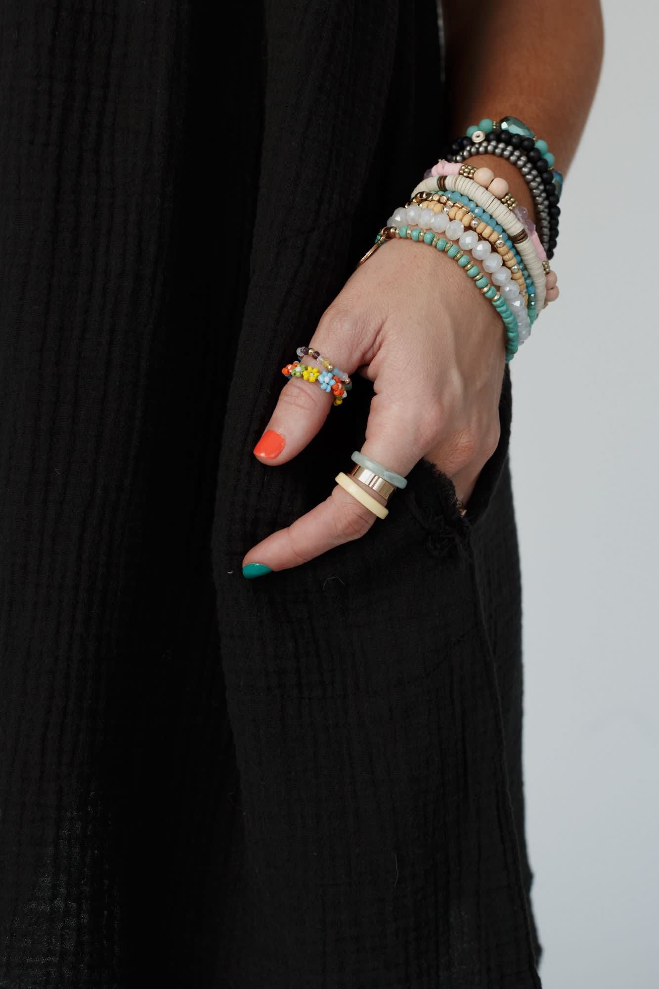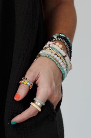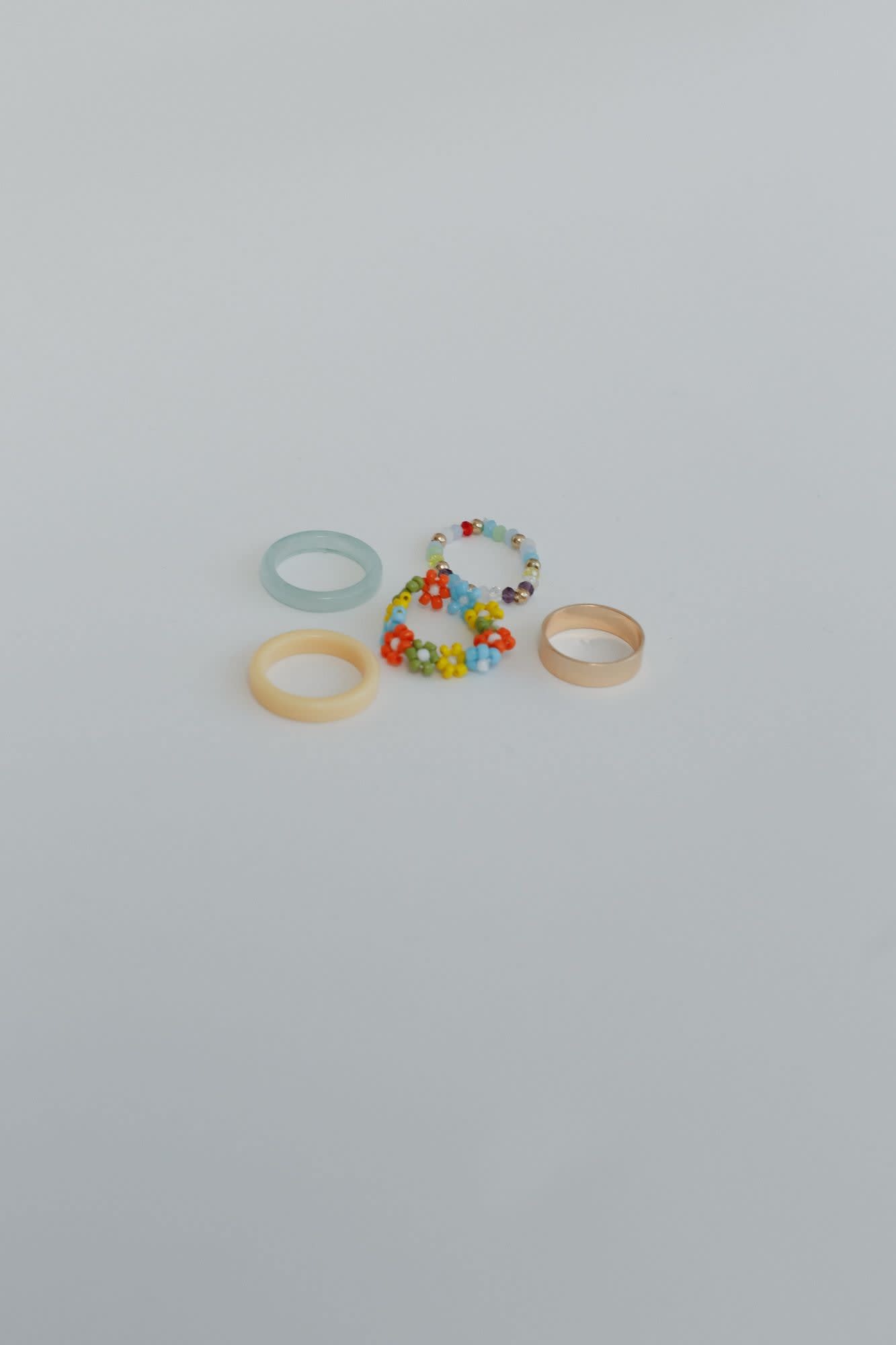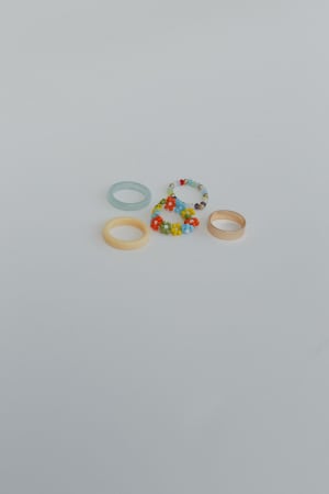 - Mixed ring designs including: floral seed bead design, assorted seed bead designs, and resin designs