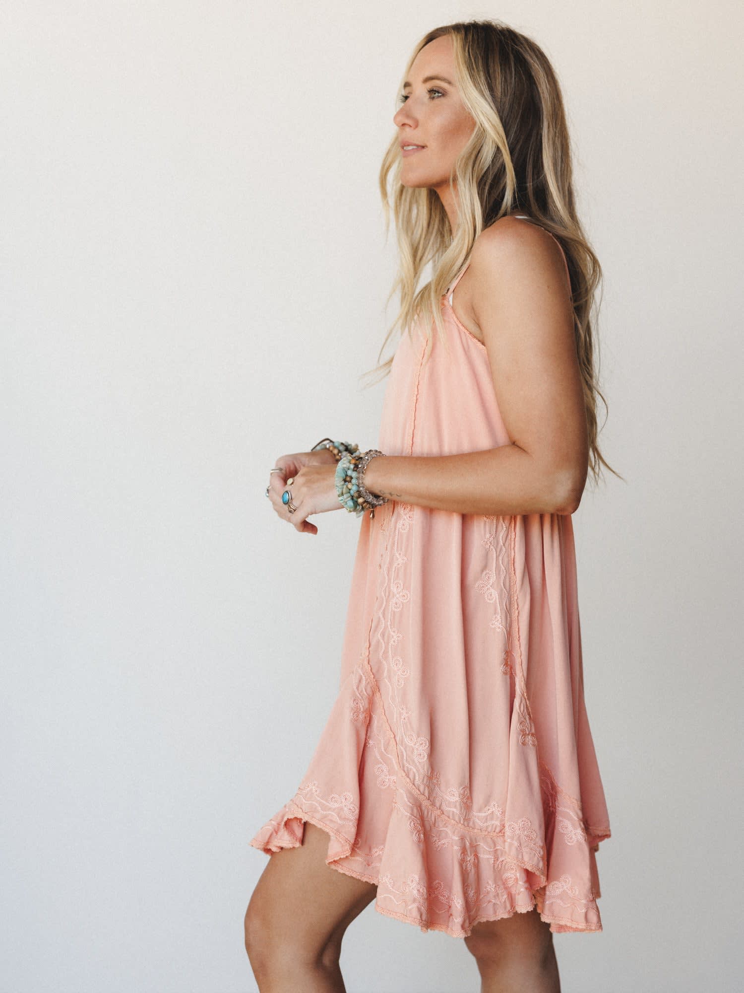 - Sleeveless design with a comfortable fit through the waist that flows into a flirty mini length.