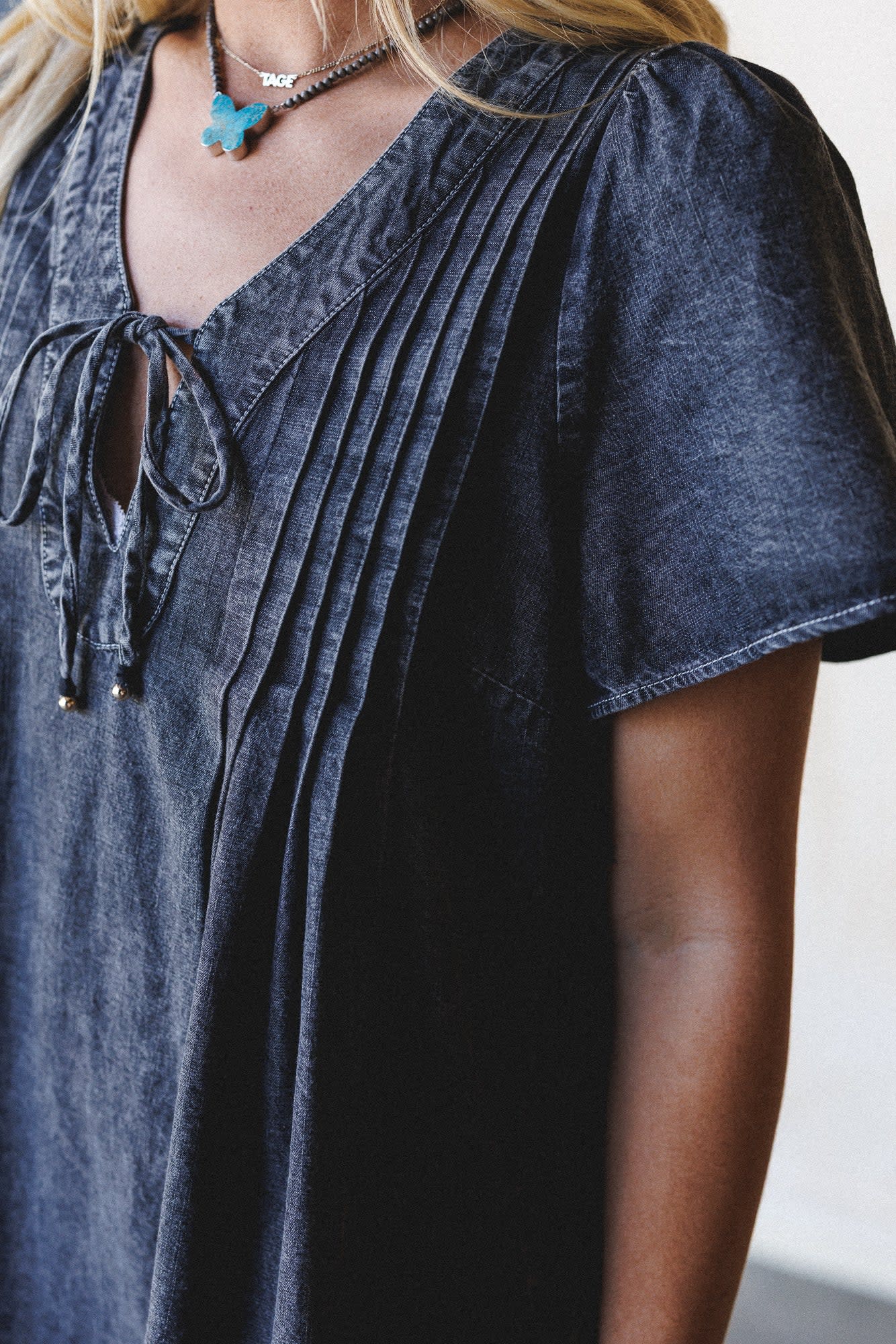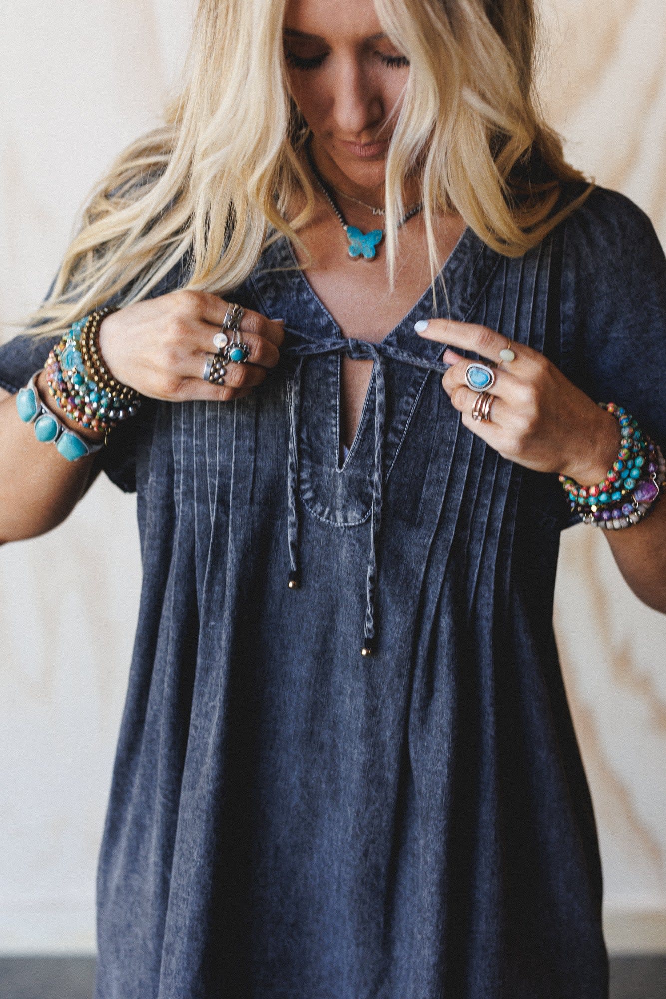 This effortless boho denim dress looks amazing with tall boots and a sun hat.