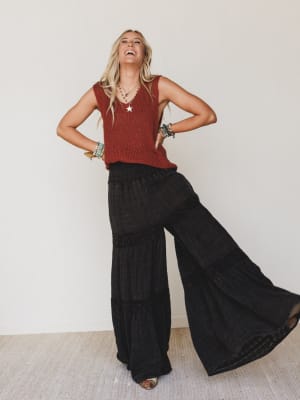 • Flowy wide-leg pants with feminine lace details and a comfortable elastic waist