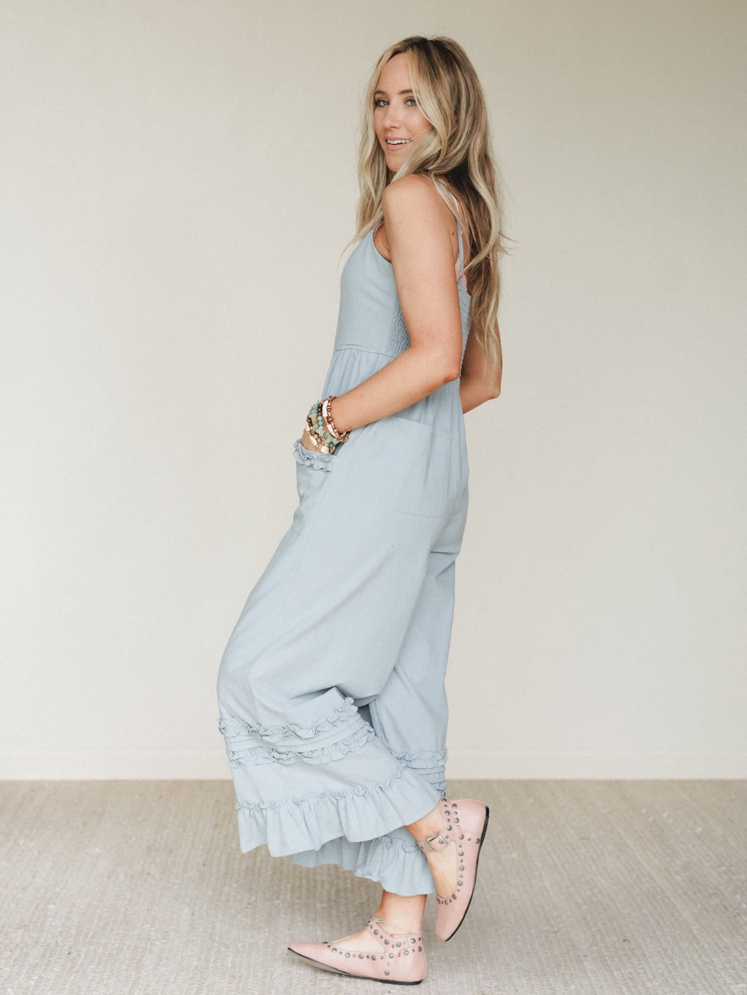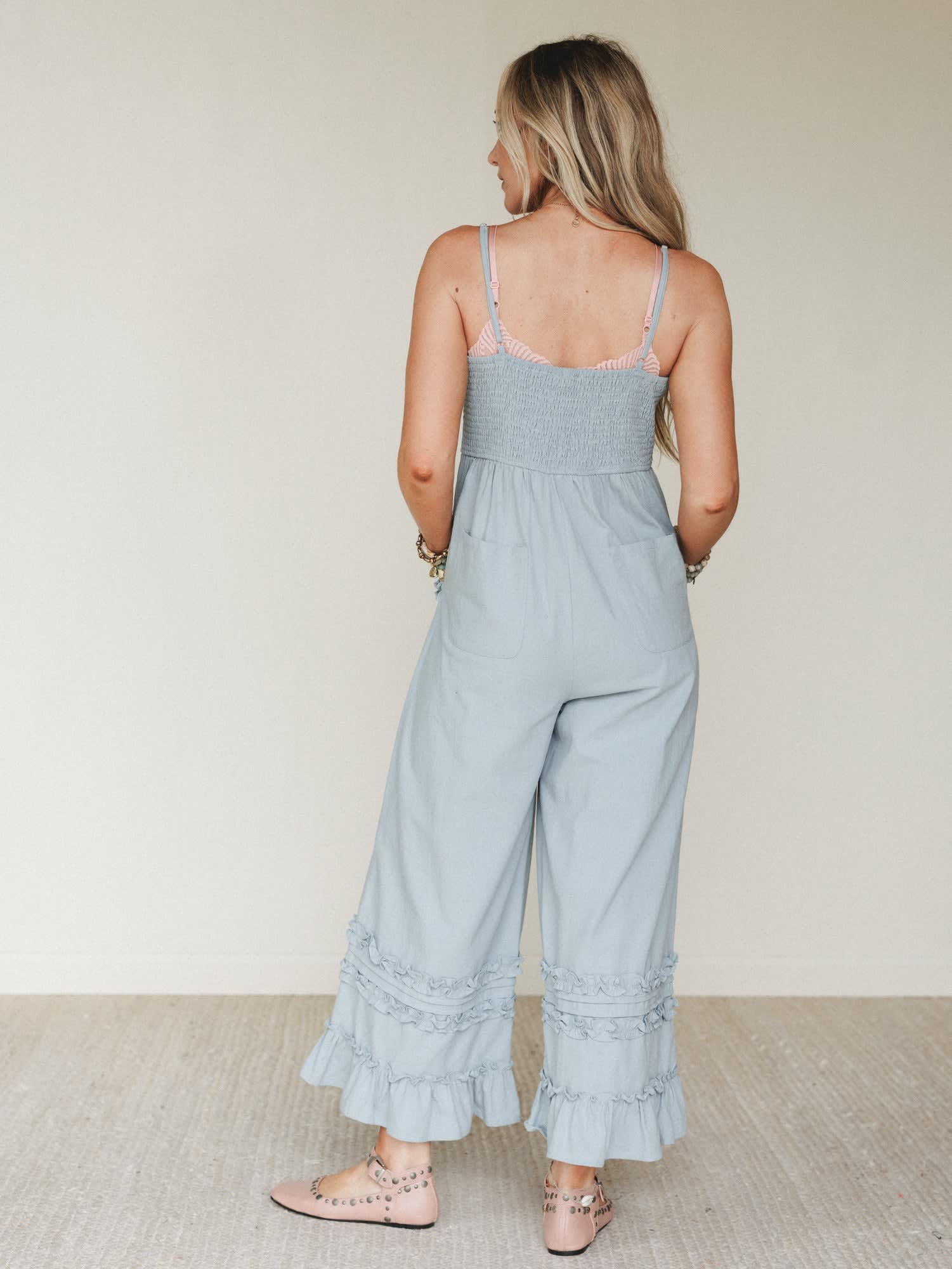 Soft chambray blue jumpsuit with feminine ruffle trim details for a playful boho jumpsuit look