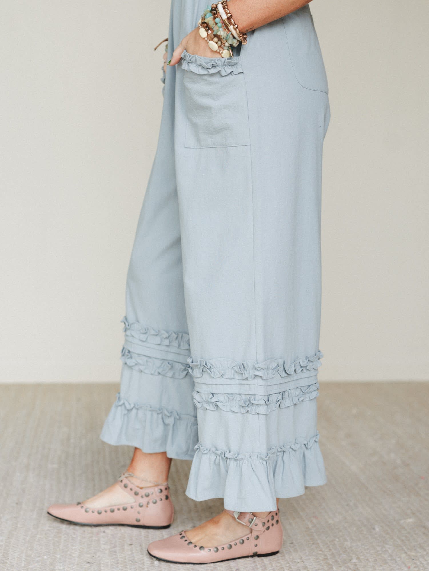 Wide leg silhouette with tiered ruffle accents that add movement and charm