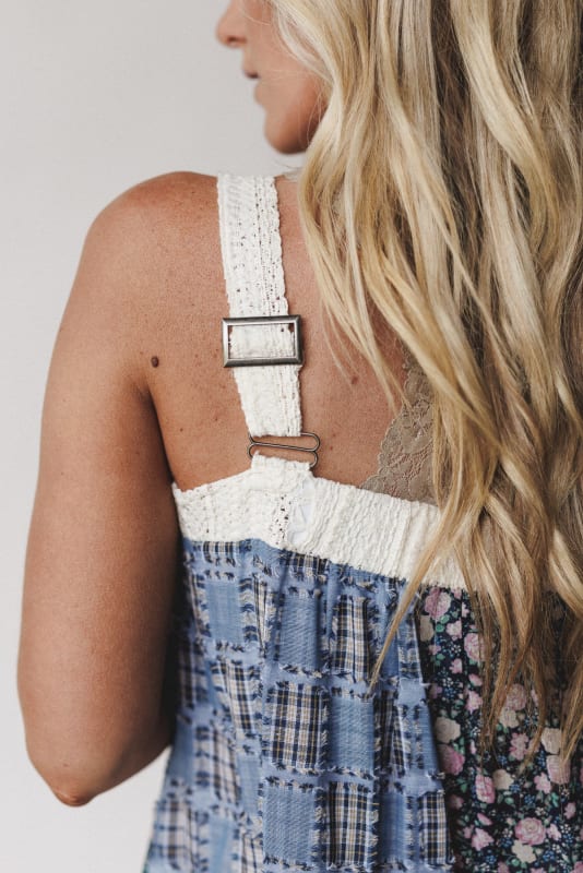 A woman with long blonde hair is seen from the back, wearing the Evermore Seamless Lace Racerback Bralette in beige and high-waisted floral patchwork pants. This chic layering piece pops against the plain white background.