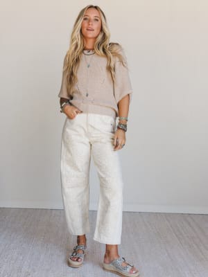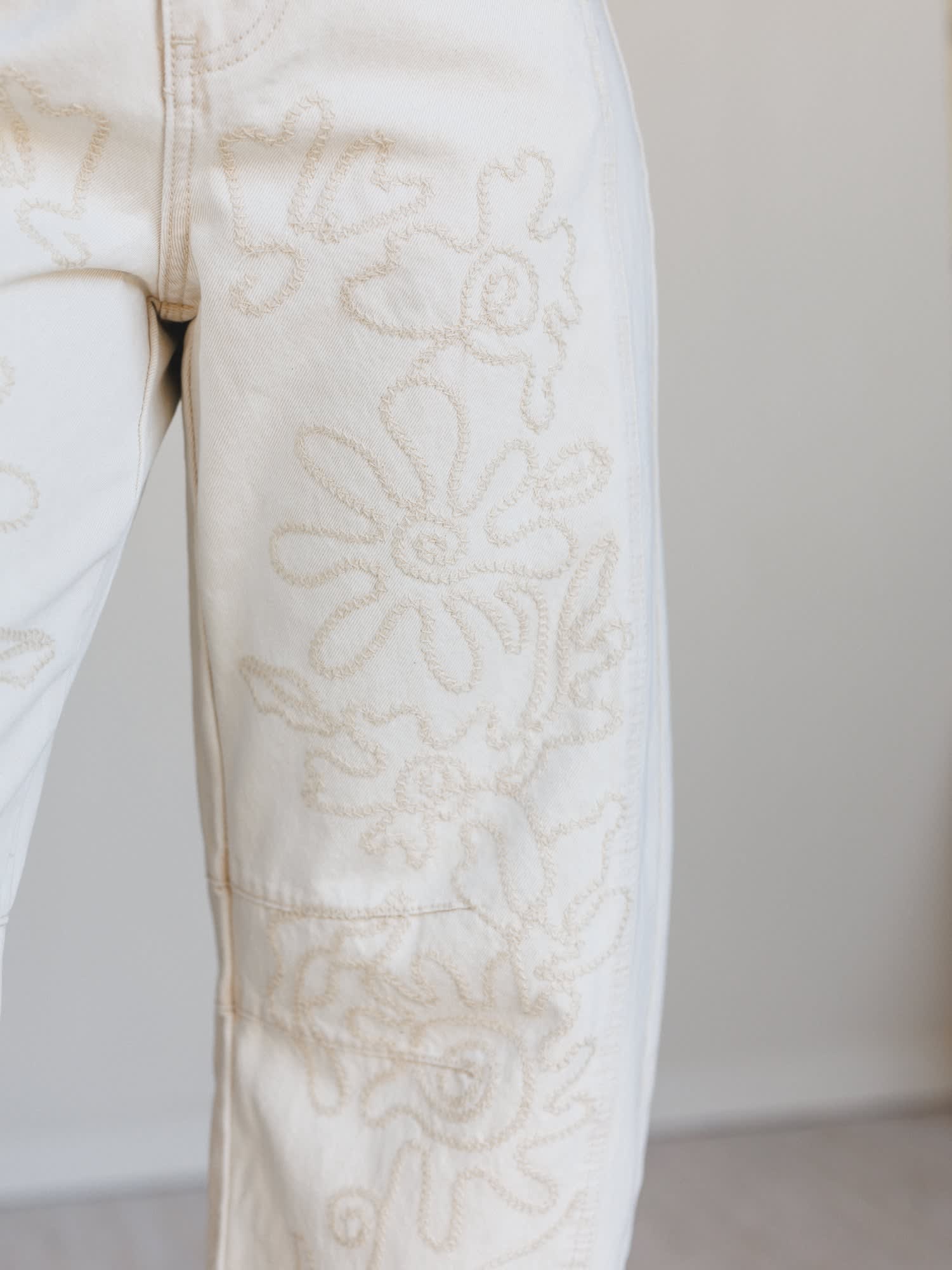 Bring playful charm to your denim collection with the Groove Bloom Pants. Designed with tonal embroidered florals and a relaxed, straight-leg silhouette, these pants offer a fresh twist on everyday style. With their high-rise fit and easy cropped length, they blend retro-inspired detail with modern comfort.