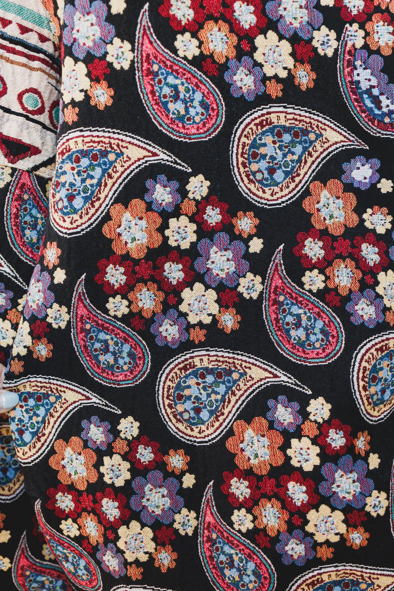 • Statement harem pants in a bold black multi patchwork print with florals, paisley, and geometric patterns