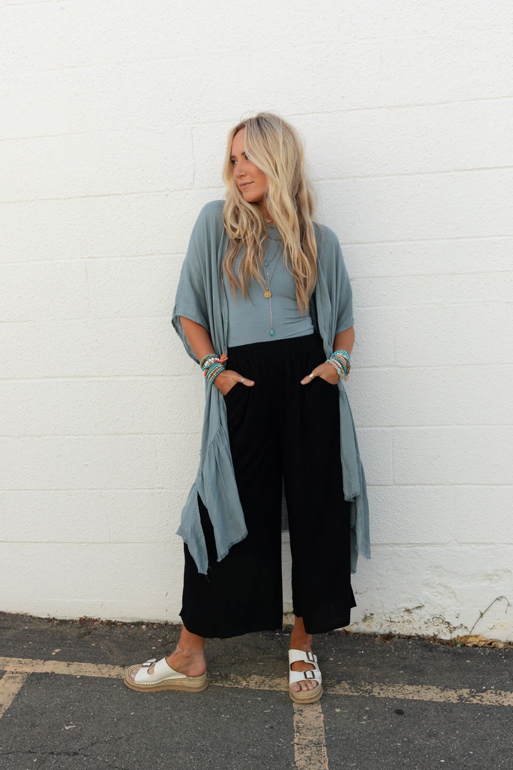 • Dropped shoulders with flowy kimono style sleeves