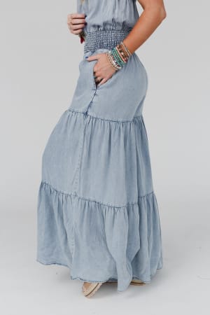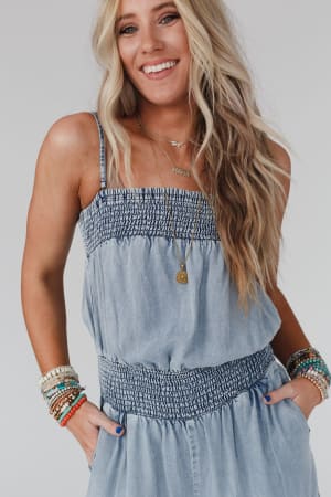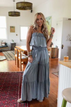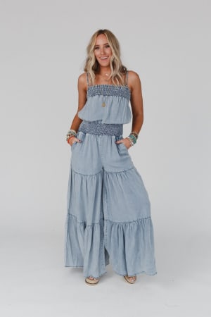 Elevate your boho style with our Harlow Wide Leg Chambray Jumpsuit - it’s the ultimate boho-chic piece for any occasion!