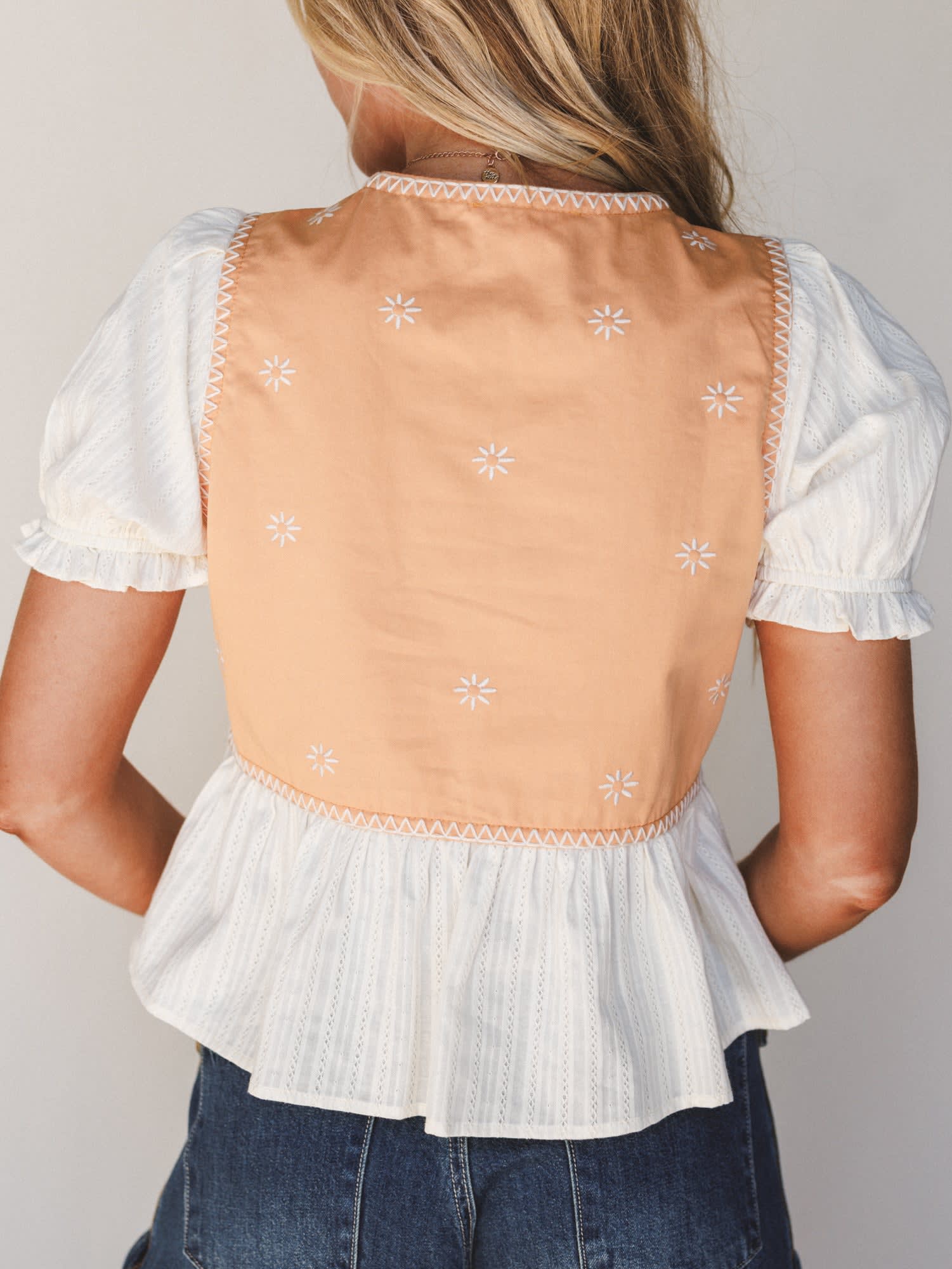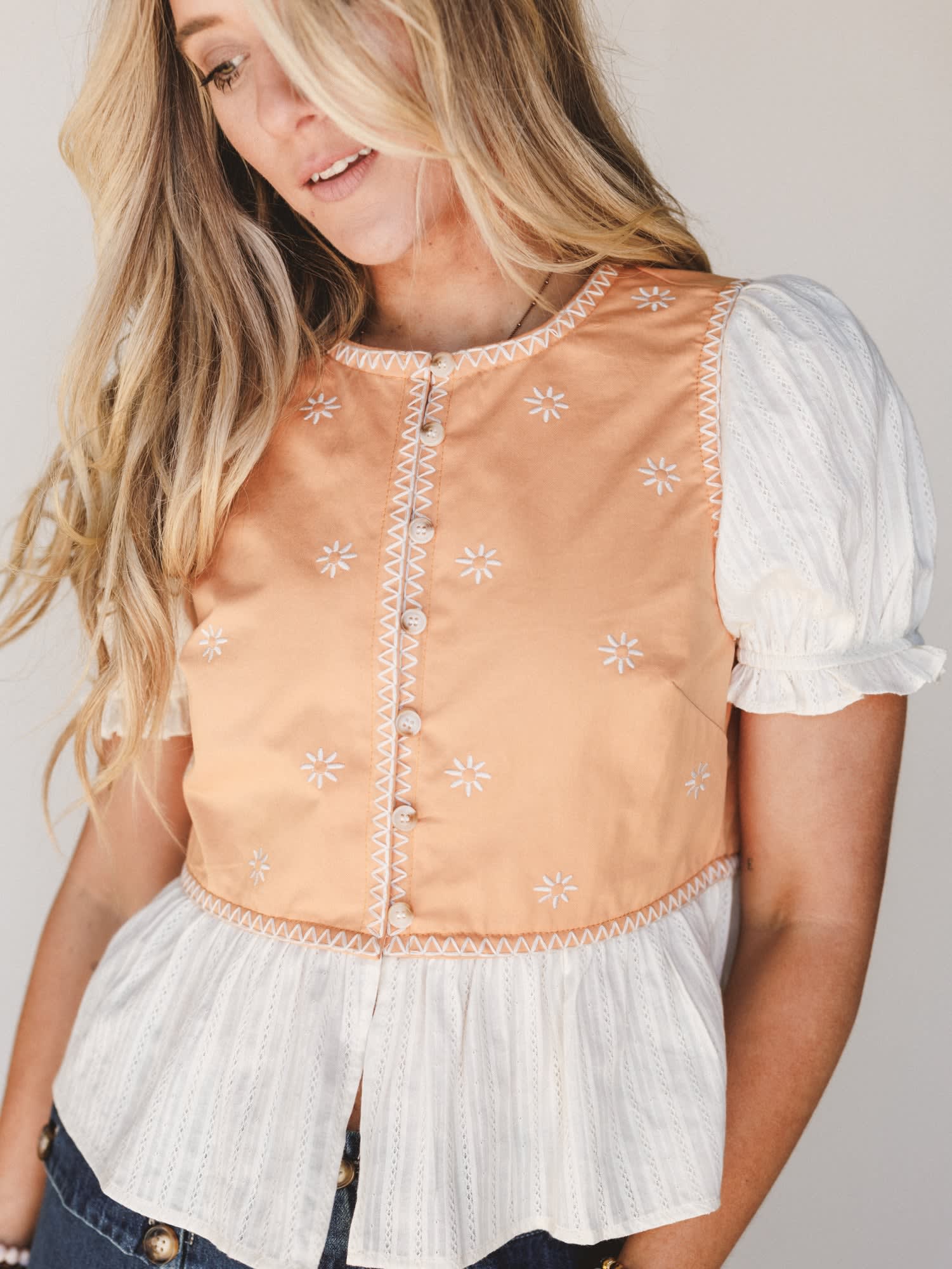 Soft apricot bodice with delicate embroidered daisy details for a sweet vintage feel