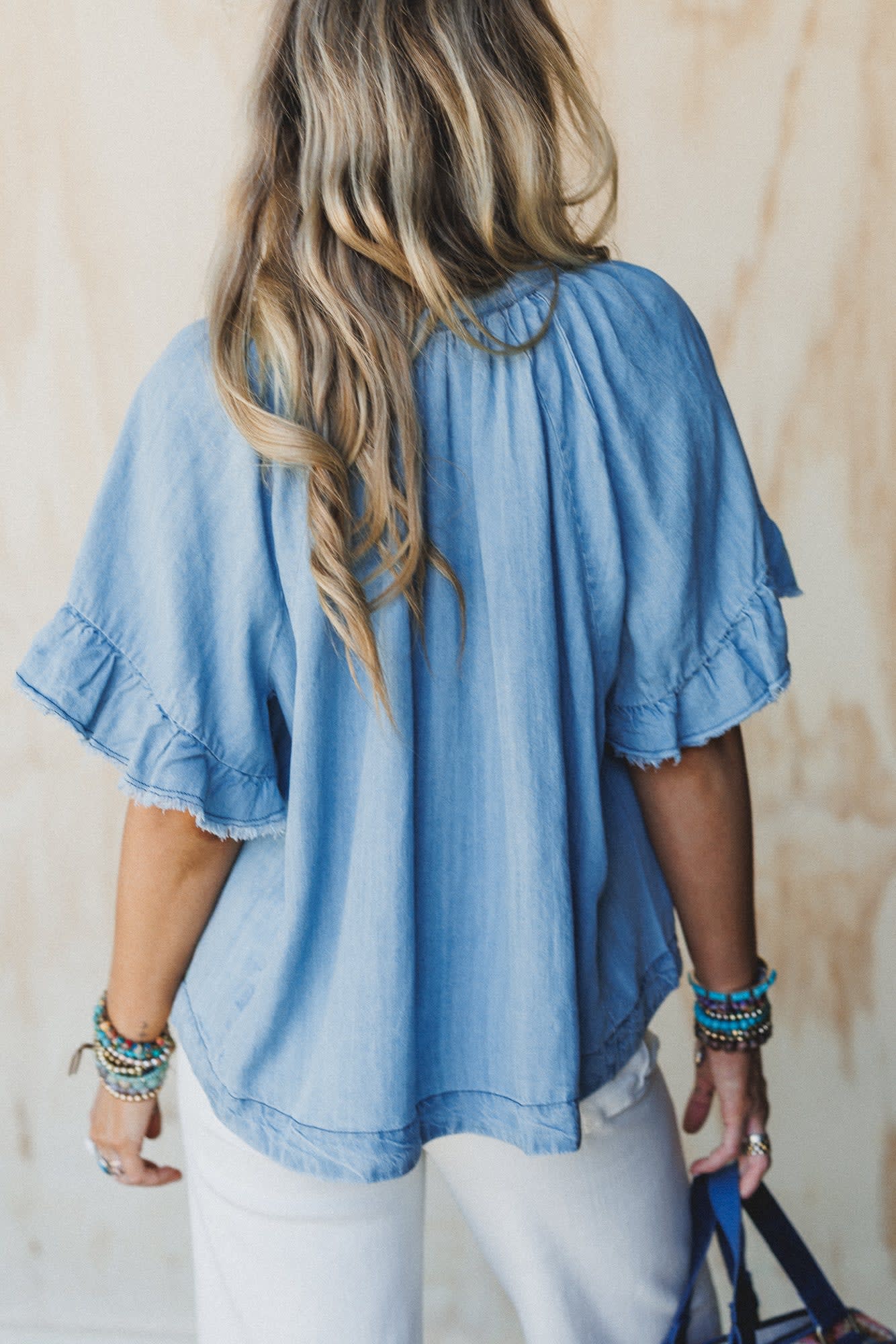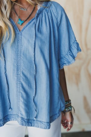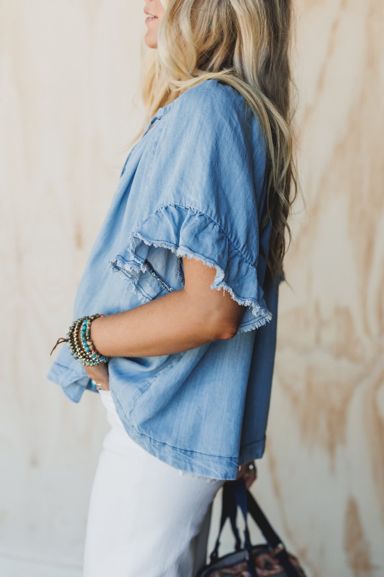 Tuck this boho denim top into a colorful maxi dress for a casual night out look.