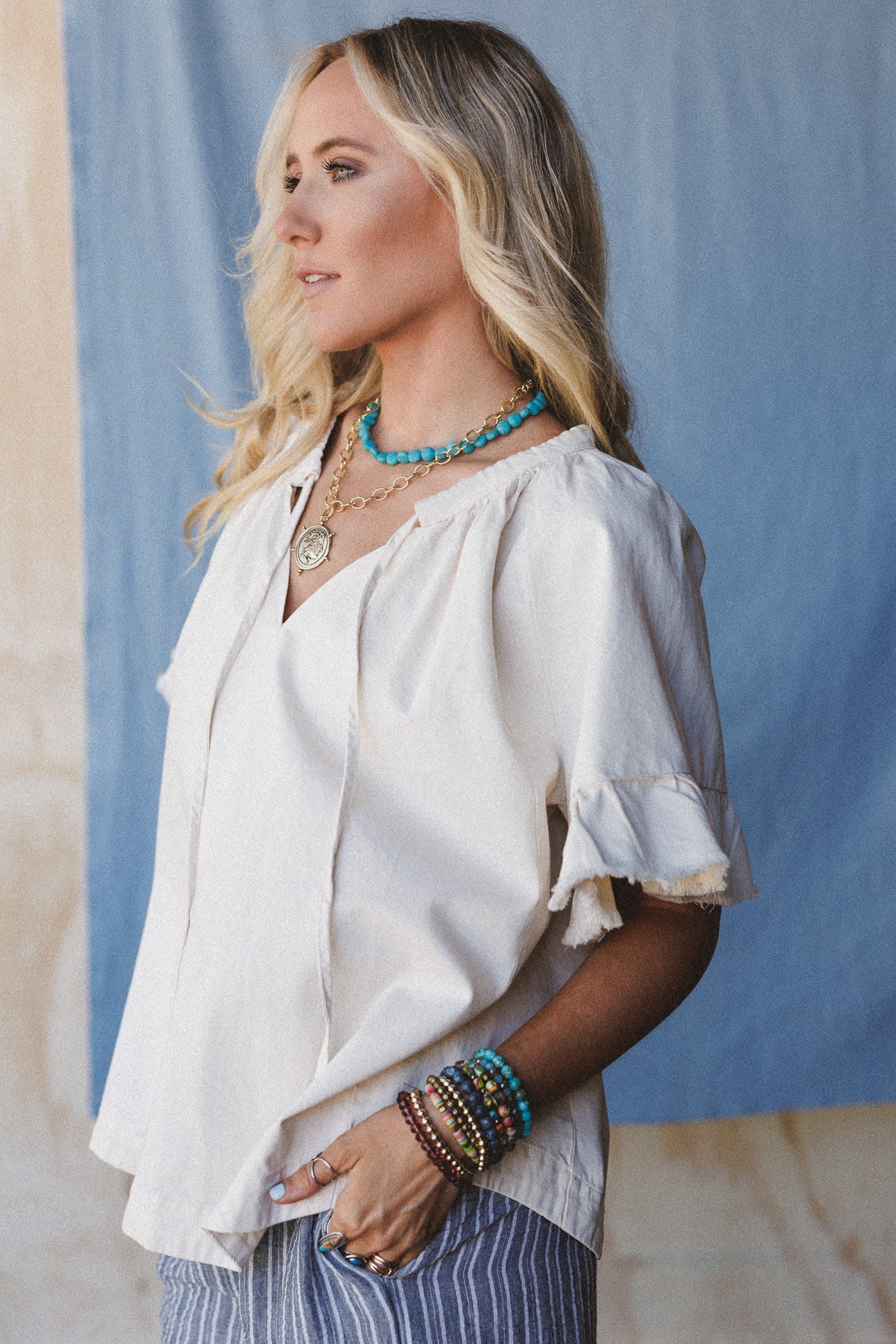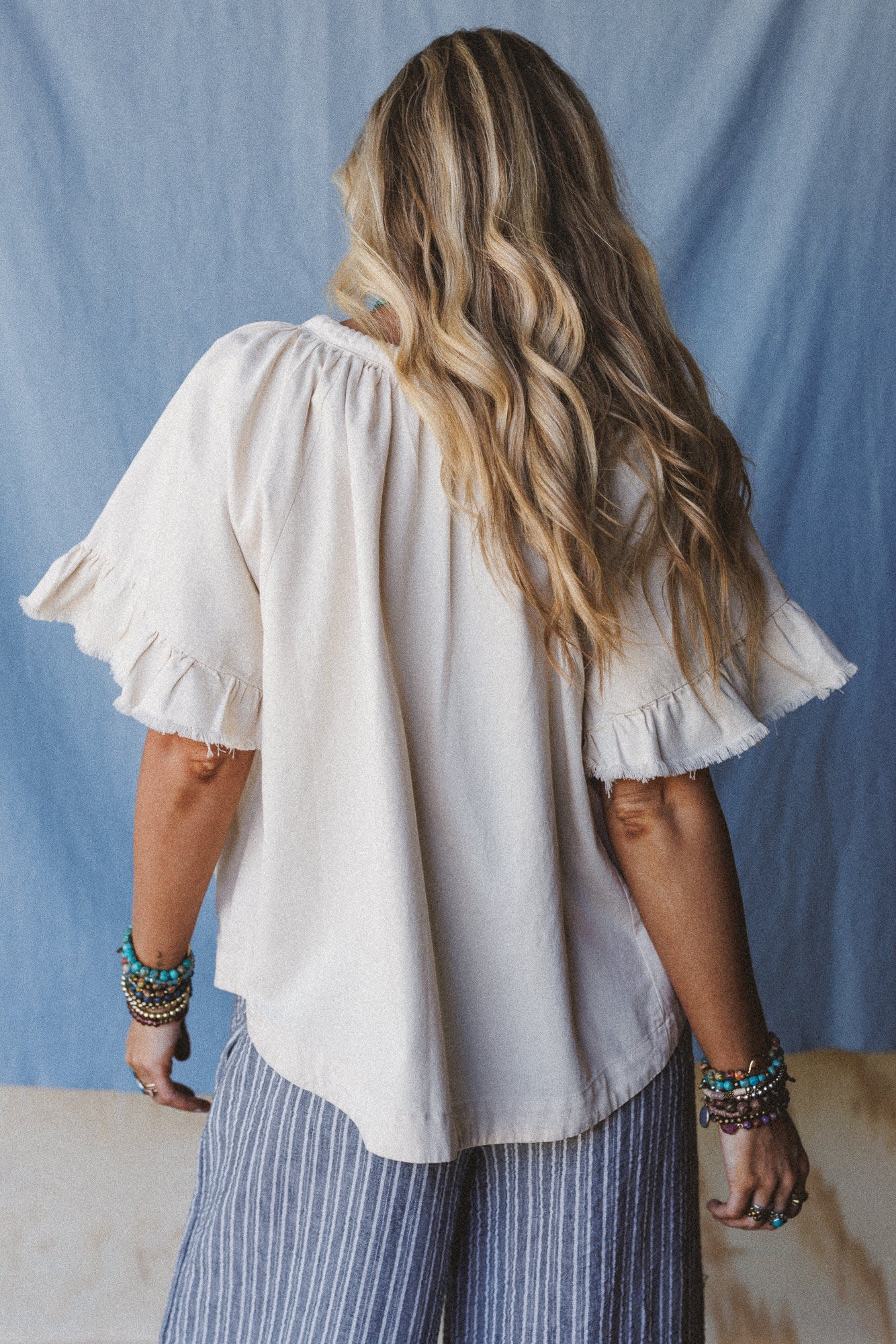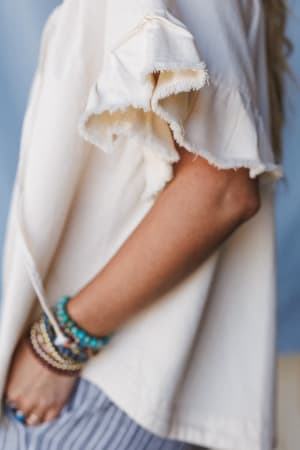 This ruffled boho top looks amazing with bell bottom jeans for a retro look.