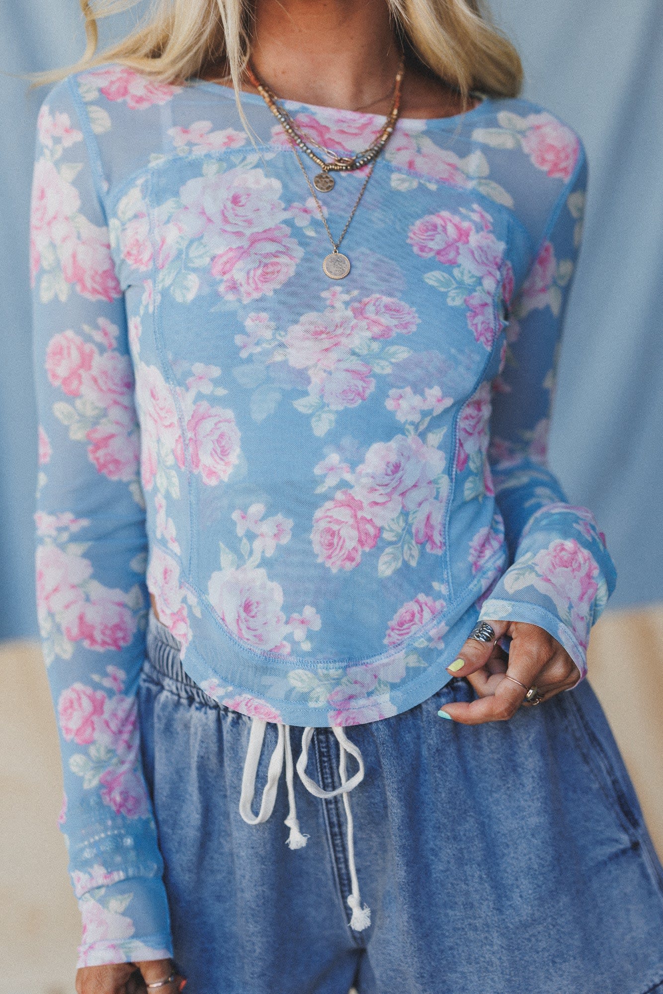 The floral sheer top is the ultimate summer layering piece that looks great with overalls.Β