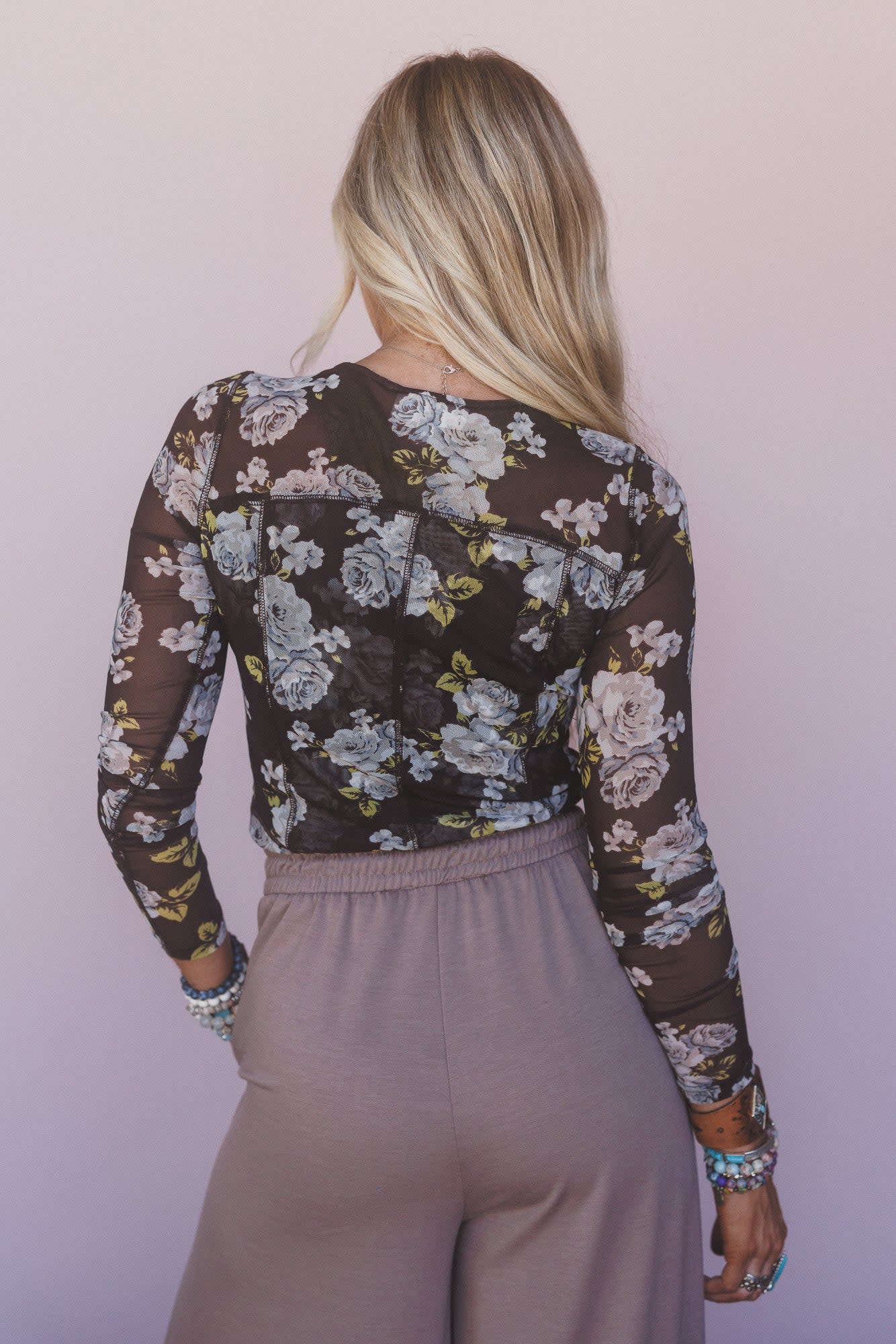 This dark floral mesh top layers effortlessly with lace bralettes and denim jackets.