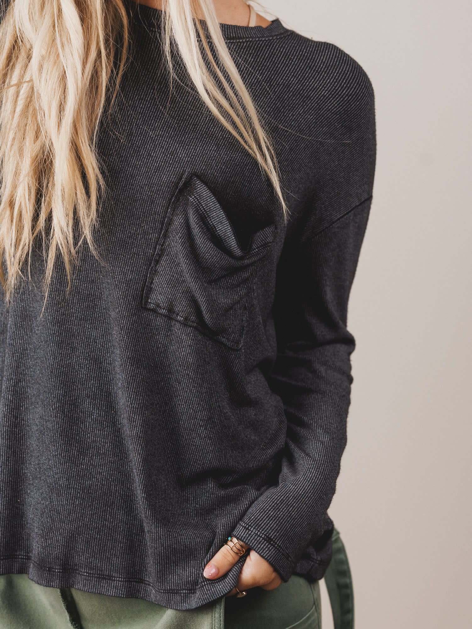- Relaxed, slouchy silhouette with dropped shoulders for all-day comfort
