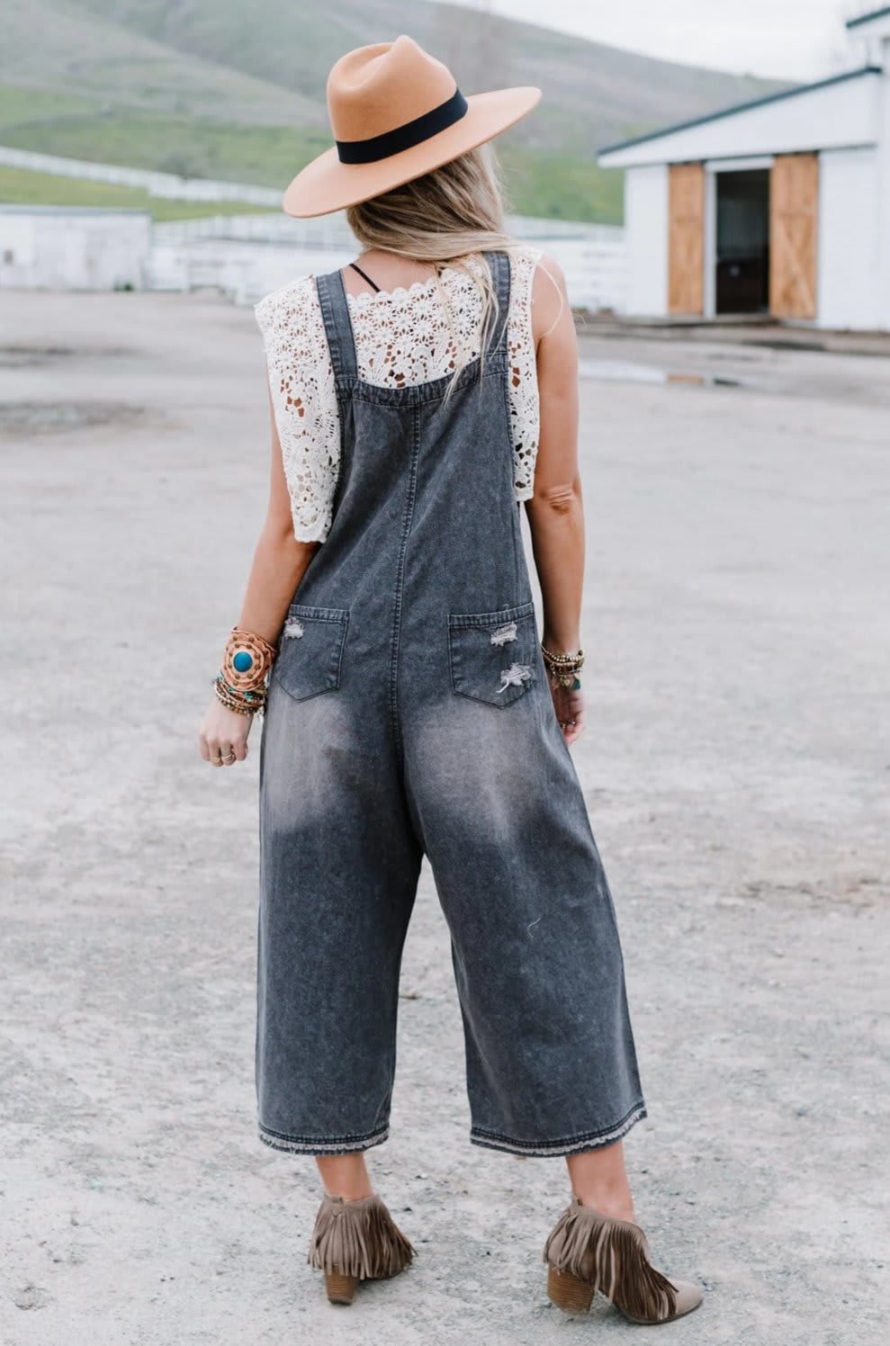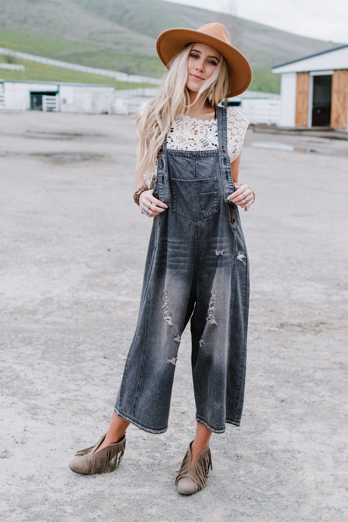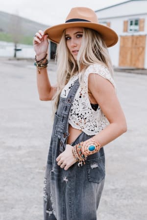 These boho denim overalls feature an oversize silhouette that makes them perfect for a laid-back look.