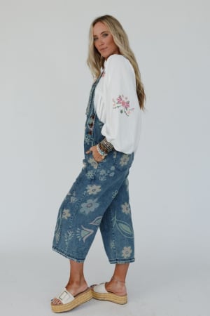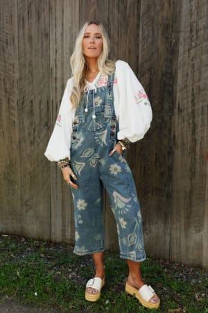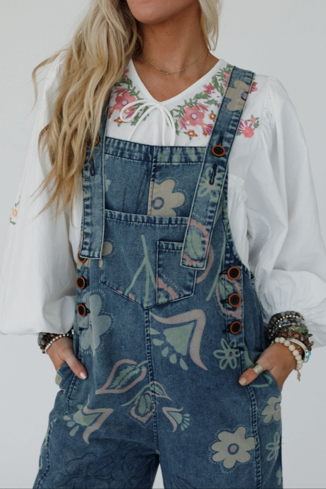 These blue denim overalls feature a gorgeous floral design that makes them stand apart from the crowd.