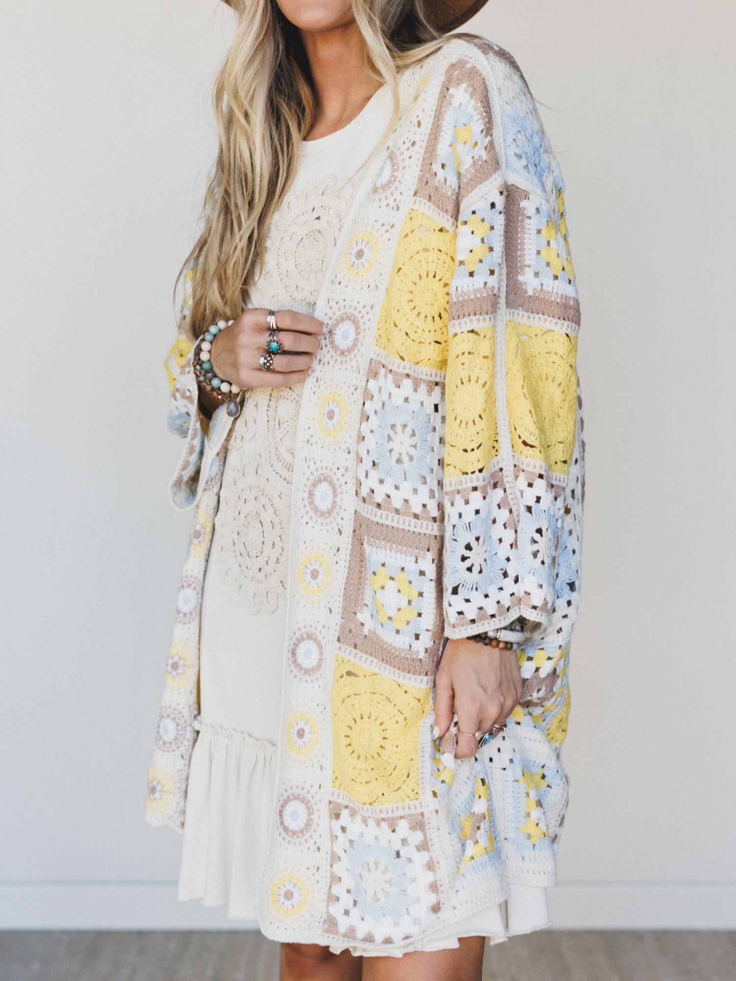 • One of those bohemian cardigans that transcends trends — the artisan crochet detail and soft color palette make it a piece you will reach for season after season.