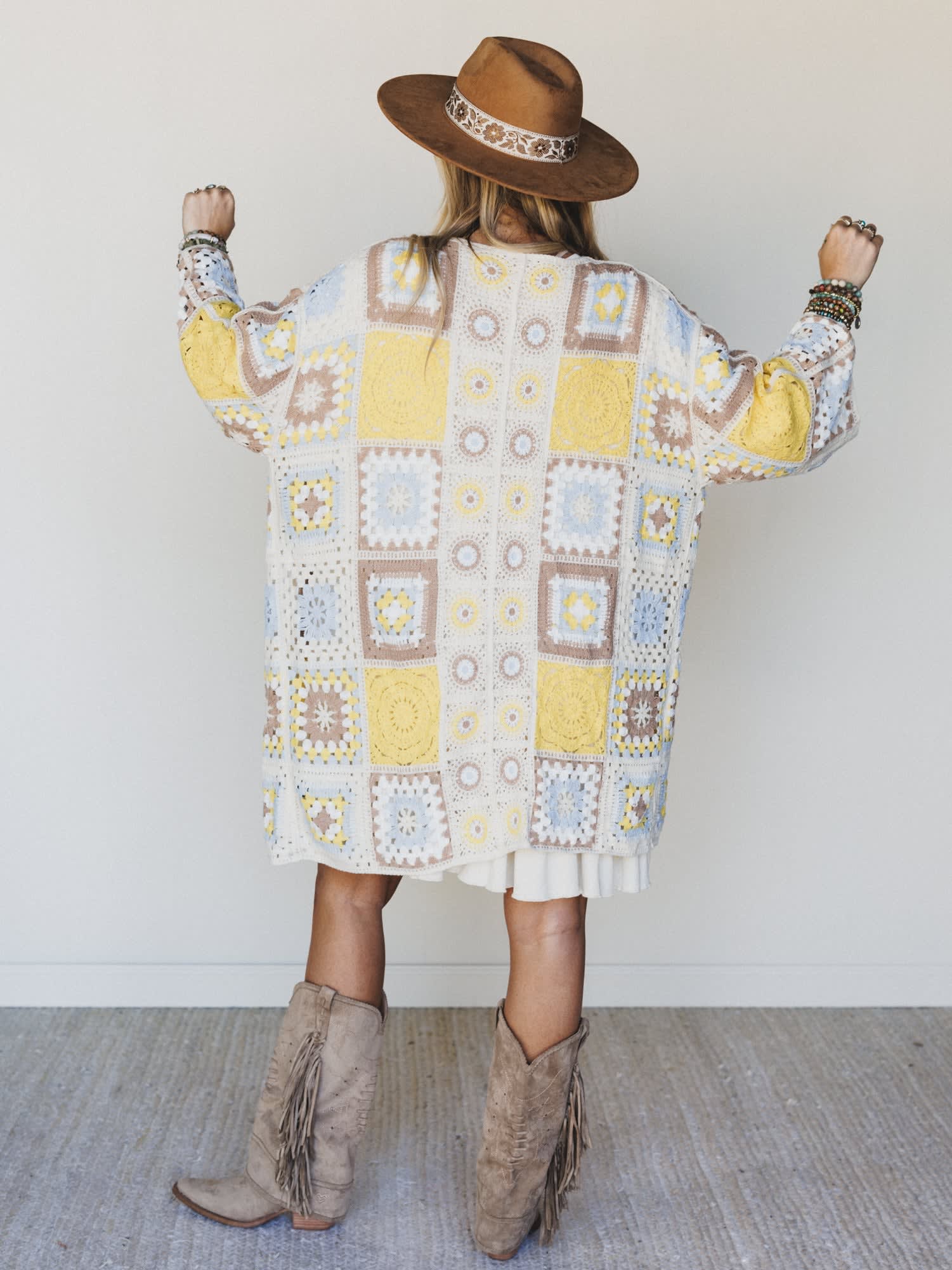 • Constructed from an intricate mix of granny square and medallion crochet motifs in a dreamy palette of yellow, blue, taupe, and cream — every panel is different, giving it a one-of-a-kind, handcrafted feel.