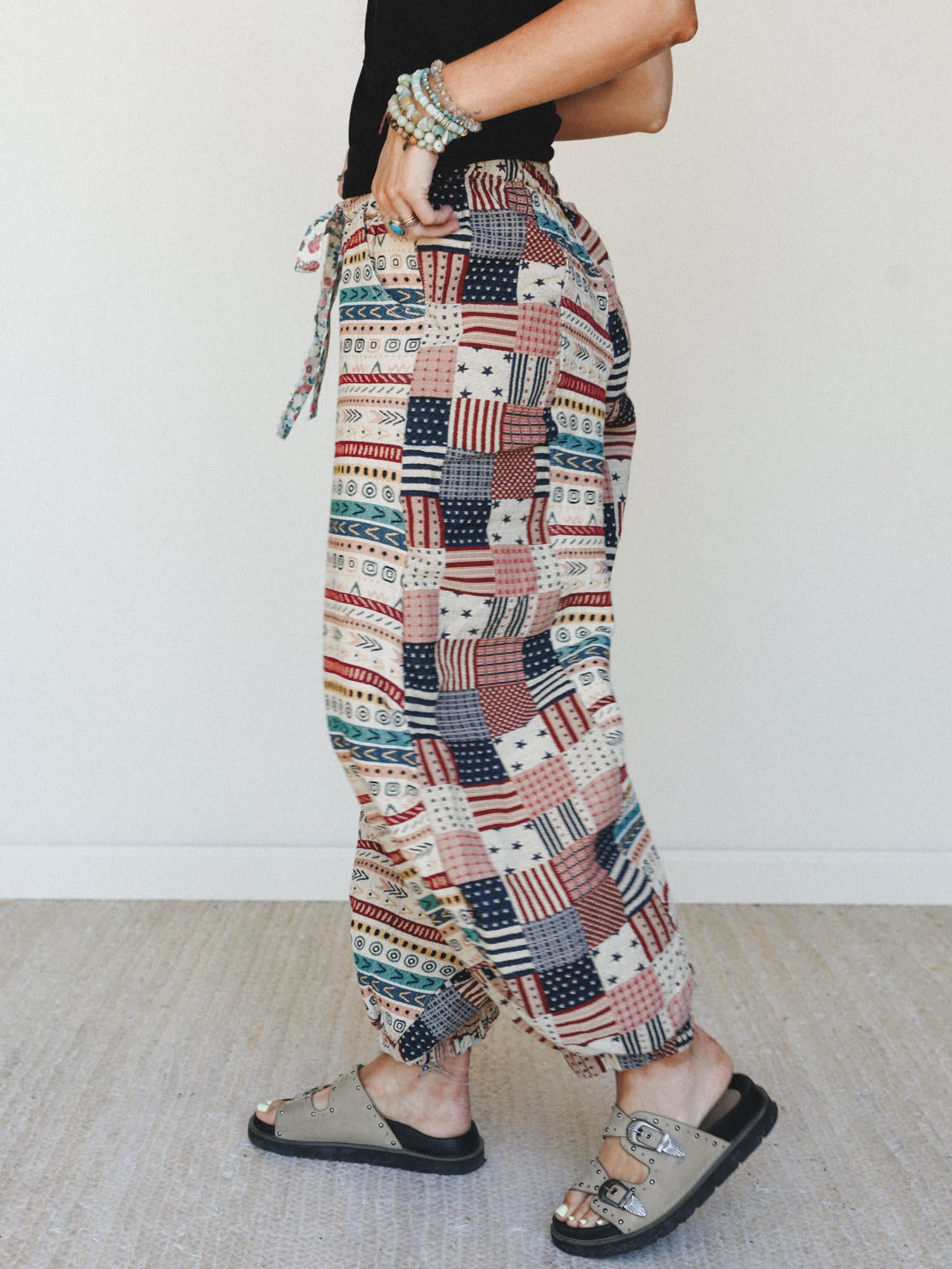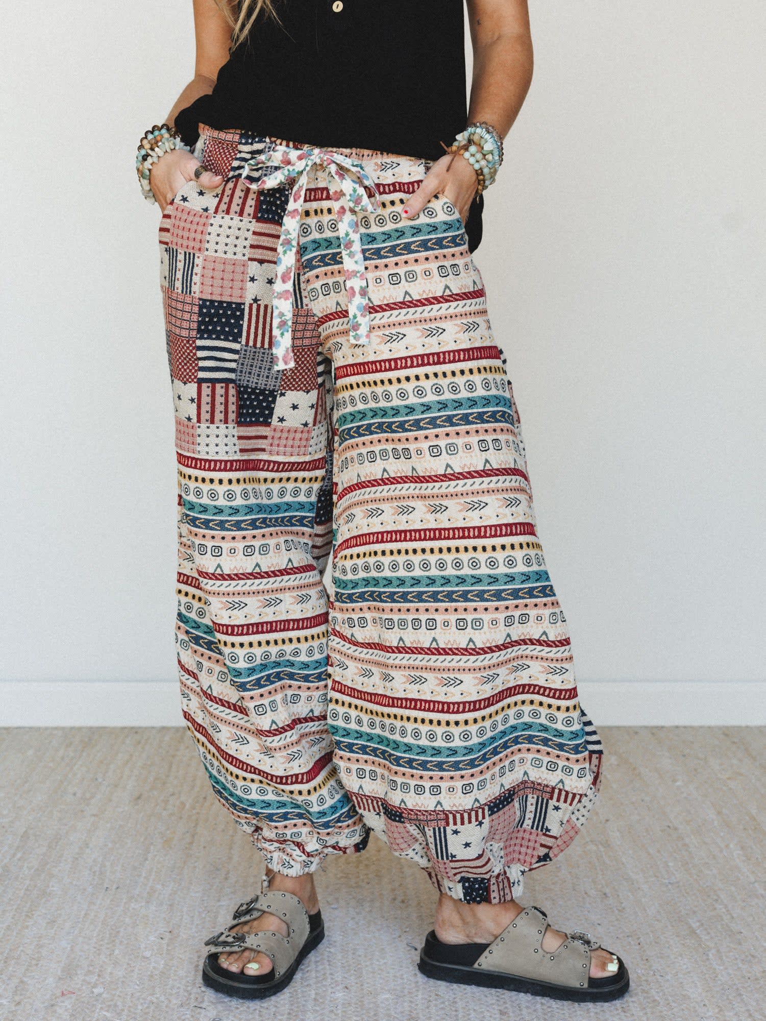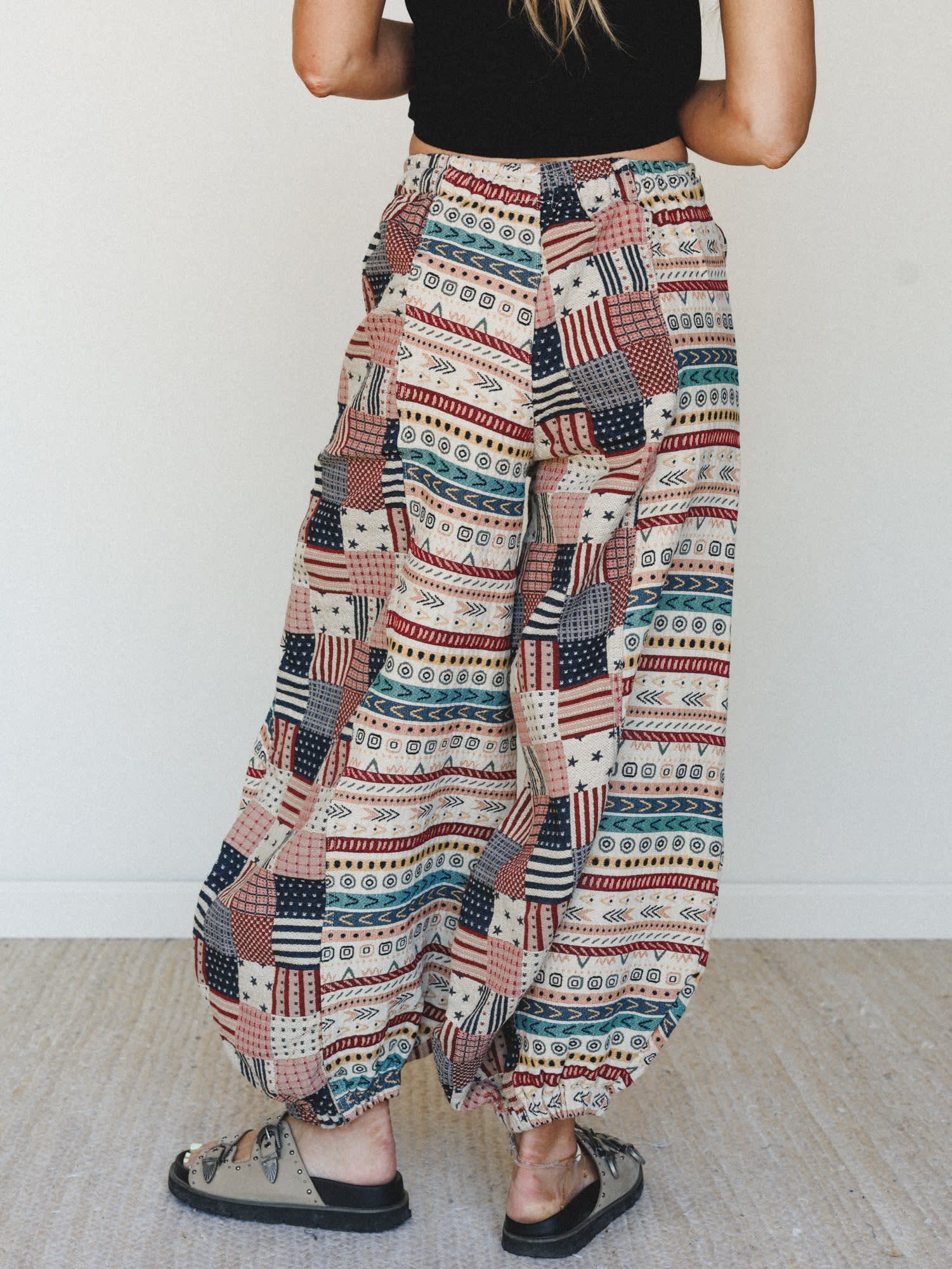 These boho wide leg pants are exactly what you need for that perfect festival outfit that flows with every step you take. The eye-catching patchwork print brings together geometric patterns and tribal-inspired motifs for authentic bohemian style.
