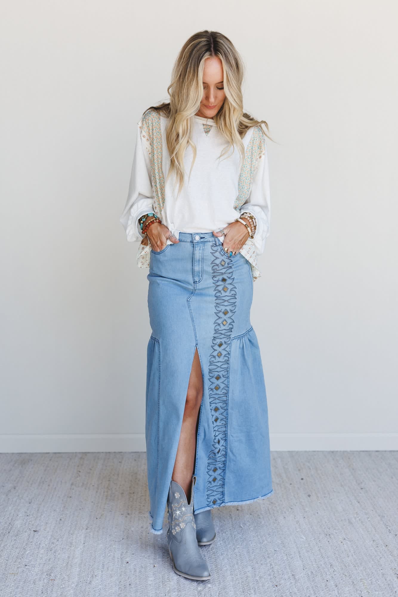 Say hello to your new denim obsession. The Honey Dust Denim Maxi Skirt blends sweet boho vibes with a western edge, making it the perfect statement piece for any season. Whether you're heading to a festival or just adding flair to your everyday, this light wash beauty is ready to roam.