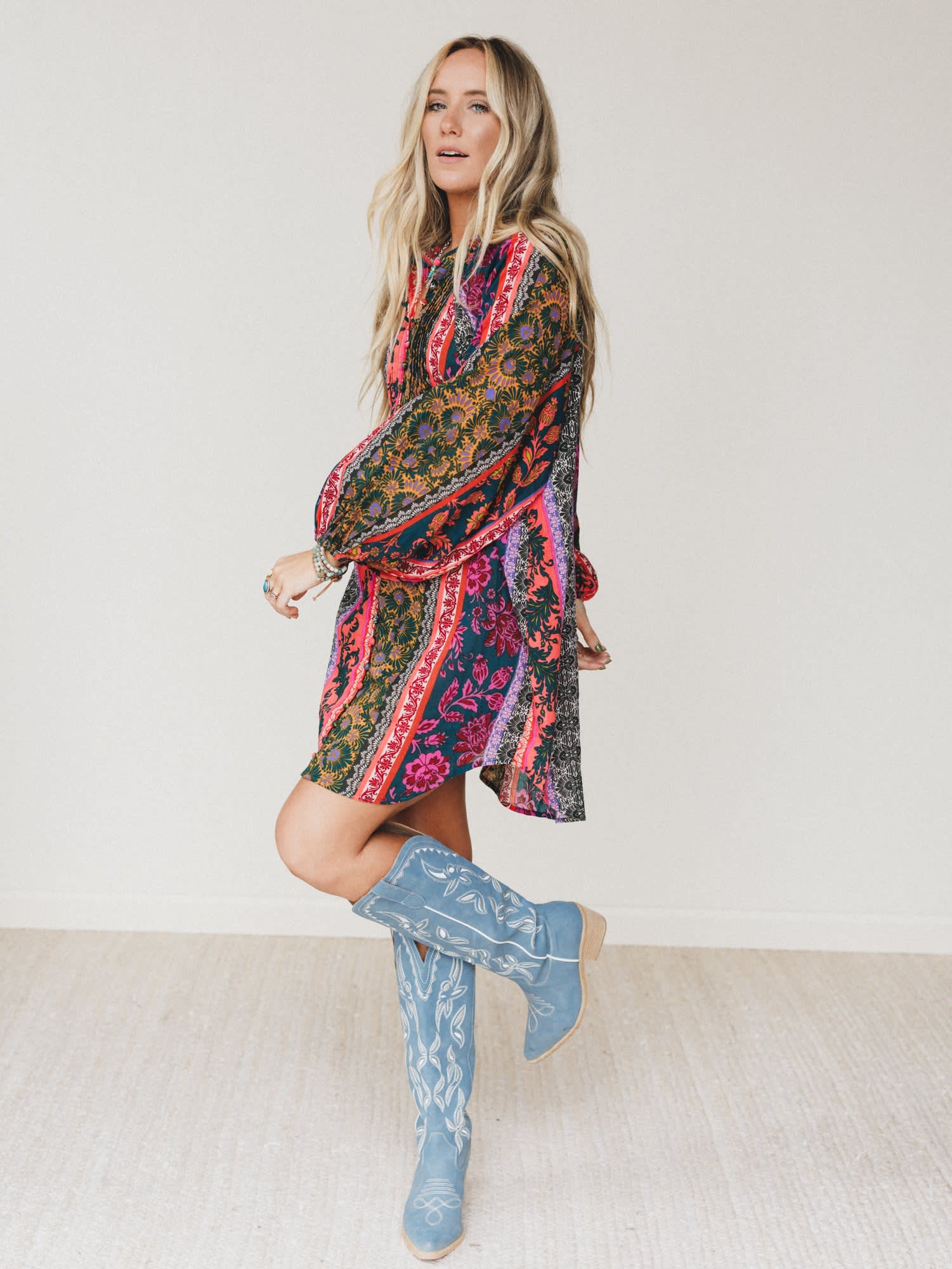 Colorful, carefree, and totally captivating—the Horizon Haze Dress is a bold expression of boho energy. Its kaleidoscope patchwork and breezy silhouette make it a one-and-done wonder for dressing up or dancing under the stars.