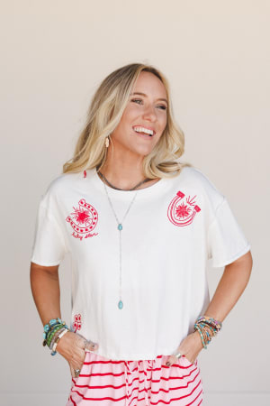 - Graphic tee featuring a vintage-style horseshoe and desert motif